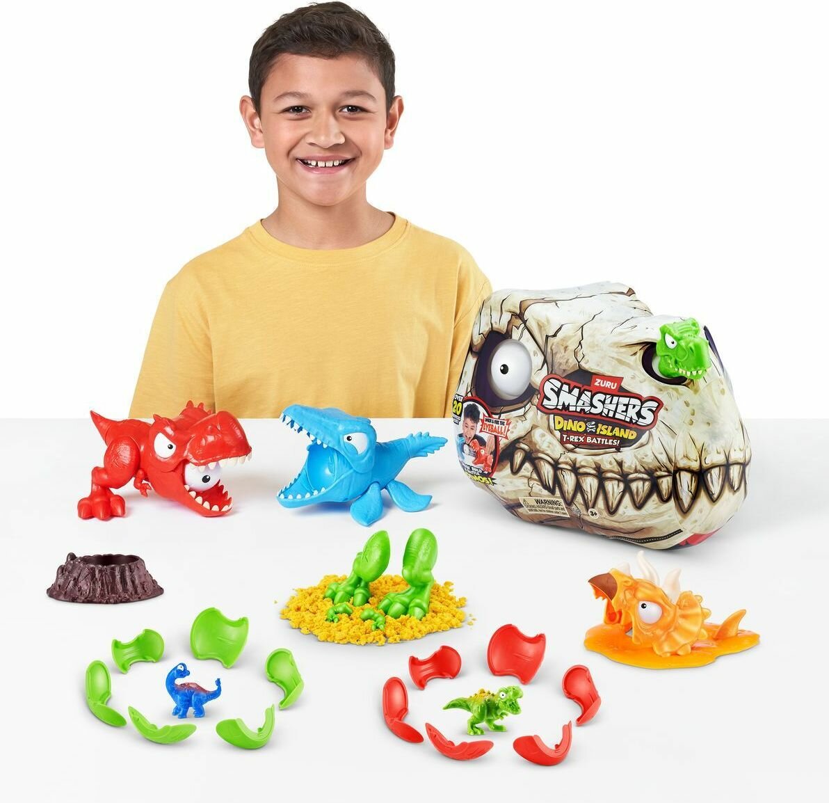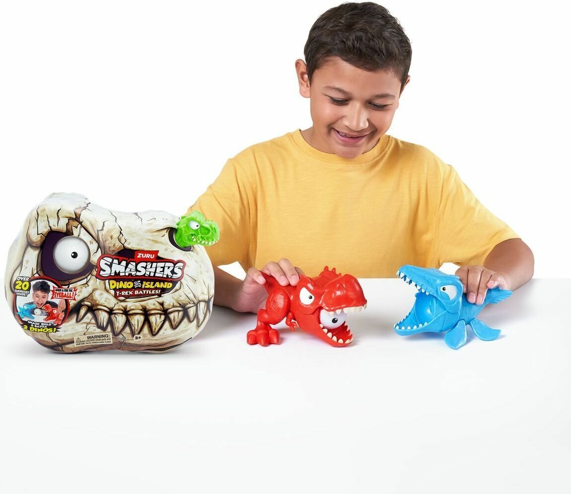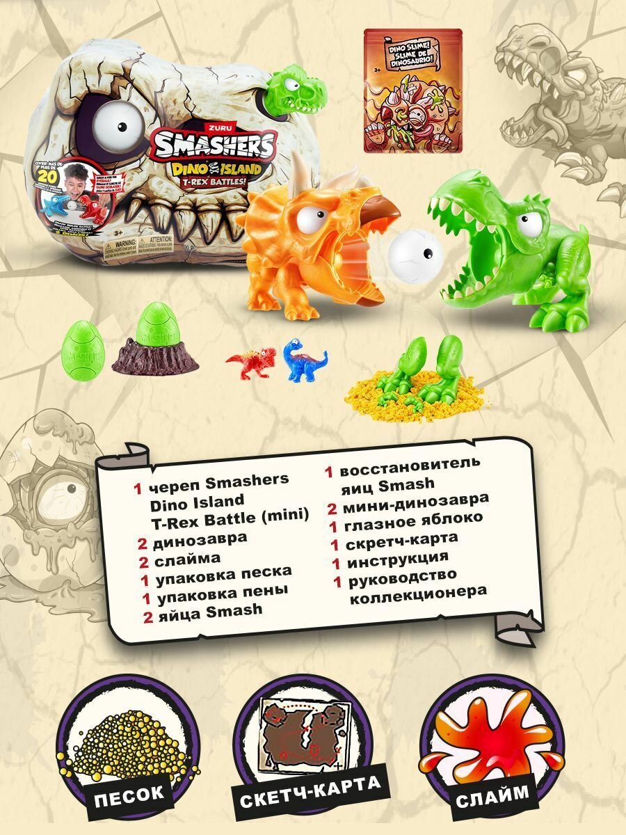 Погрузитесь в захватывающие битвы динозавров с нашей оригинальной игрушкой для мальчиков ZURU Smashers Dino Island Mini T-Rex Battles 74114 ! Это не просто интерактивная игрушка, это настоящее приключение в мире доисторических существ-динозавров.Каждый раунд начинается с поисков окаменелостей в песке и слайме, где скрыты части динозавров. Раскопайте, исследуйте и соберите их, и оживите скелеты! Установите светящееся глазное яблоко в пасть одного из динозавров, нажмите на кнопку управления хвостом, и представьте себе, как он атакует противника- другого динозавра!Игровой набор для мальчиков Зуру Смешерс Dino Island Mini T-Rex Battles содержит более 20 детских игрушек сюрпризов, которые помогут вам разбивать, строить и сражаться. Готовы ли вы отправиться в захватывающее приключение по острову динозавров?Детские интересные игрушки от ZURU - это отличный подарочный набор на день рождения, новый год, либо просто так, хороший подарок без повода! Детский набор будет отличным подарком мальчику, брату или даже другу. Успейте порадовать ребенка на праздник! Будем рады, если оставите отзыв.Характеристики:- Для детей от 5 - 6 лет;- Содержит мелкие детали. Не подходит детям до 3 лет.Особенности:- Разбейте мини-яйца, чтобы отыскать коллекционные фигурки. Используйте восстановитель, чтобы делать это снова и снова;- Дино отлично детализированы и выглядят очень реалистично;- Дети смогут почувствовать себя археологами, раскапывающими древних динозавров;- Крутые игрушки для мальчиков изготовлены из экологически чистых материалов, безопасных для здоровья детей.В комплекте:- 1 Череп Smashers;- 2 Динозавра;- 2 Слайма;- 1 Упаковка кинетического песка;- 1 Упаковка пены;- 2 Мини яйца Smash;- 1 Восстановитель яиц Smash;- 2 Мини-персонажа;- 1 Игрушечное глазное яблоко;- 1 Карта Scratch n' Find;- 1 Инструкция;- 1 Руководство коллекционера.внимание! Конкретный вариант товара станет известен только после покупки и вскрытия упаковки (сюрприз).