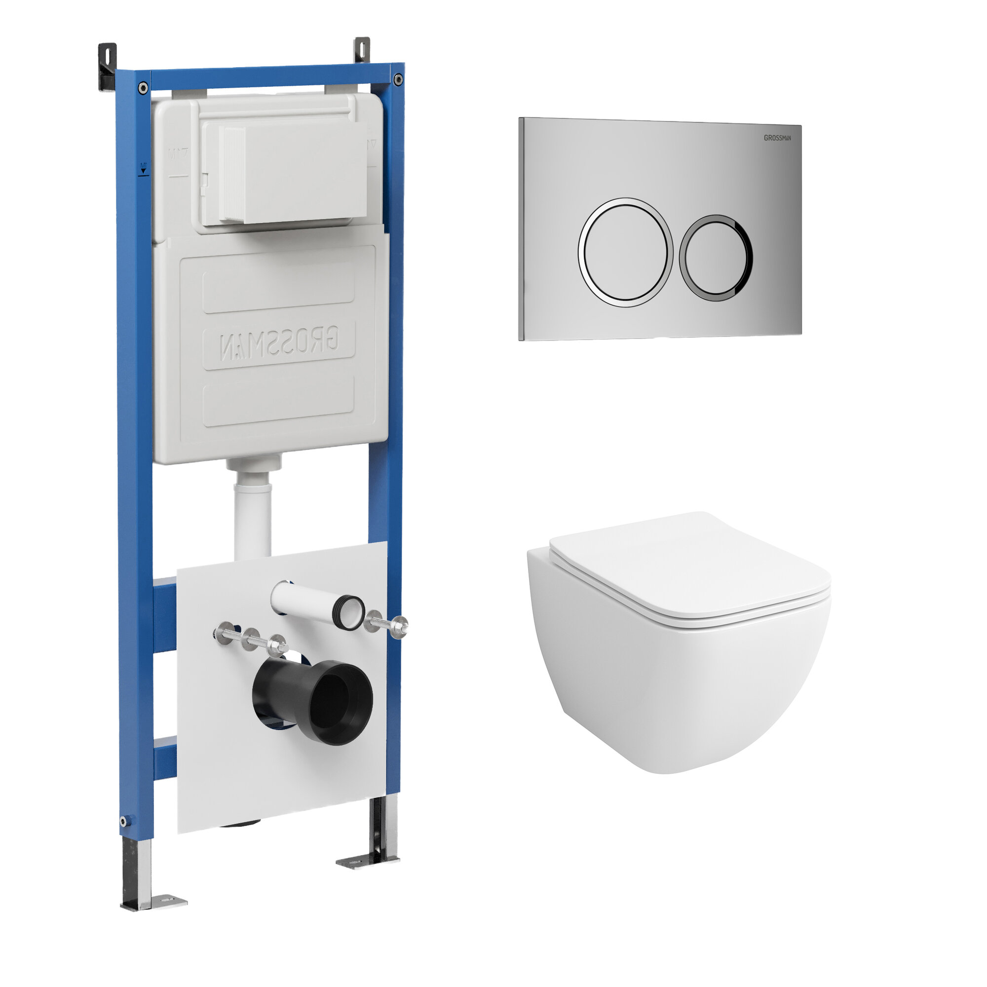Комплект Унитаз подвесной с инсталляцией Grossman Galaxy 97.4447S.01.110 безободковый, белый+ Кнопка смыва хром матовый