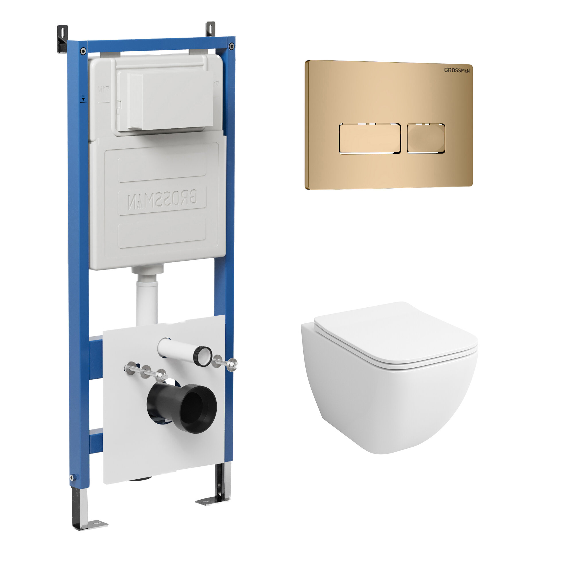 Комплект Унитаз подвесной с инсталляцией Grossman Pragma 97.4447S.03.310 безободковый, белый+ Кнопка смыва золото матовое