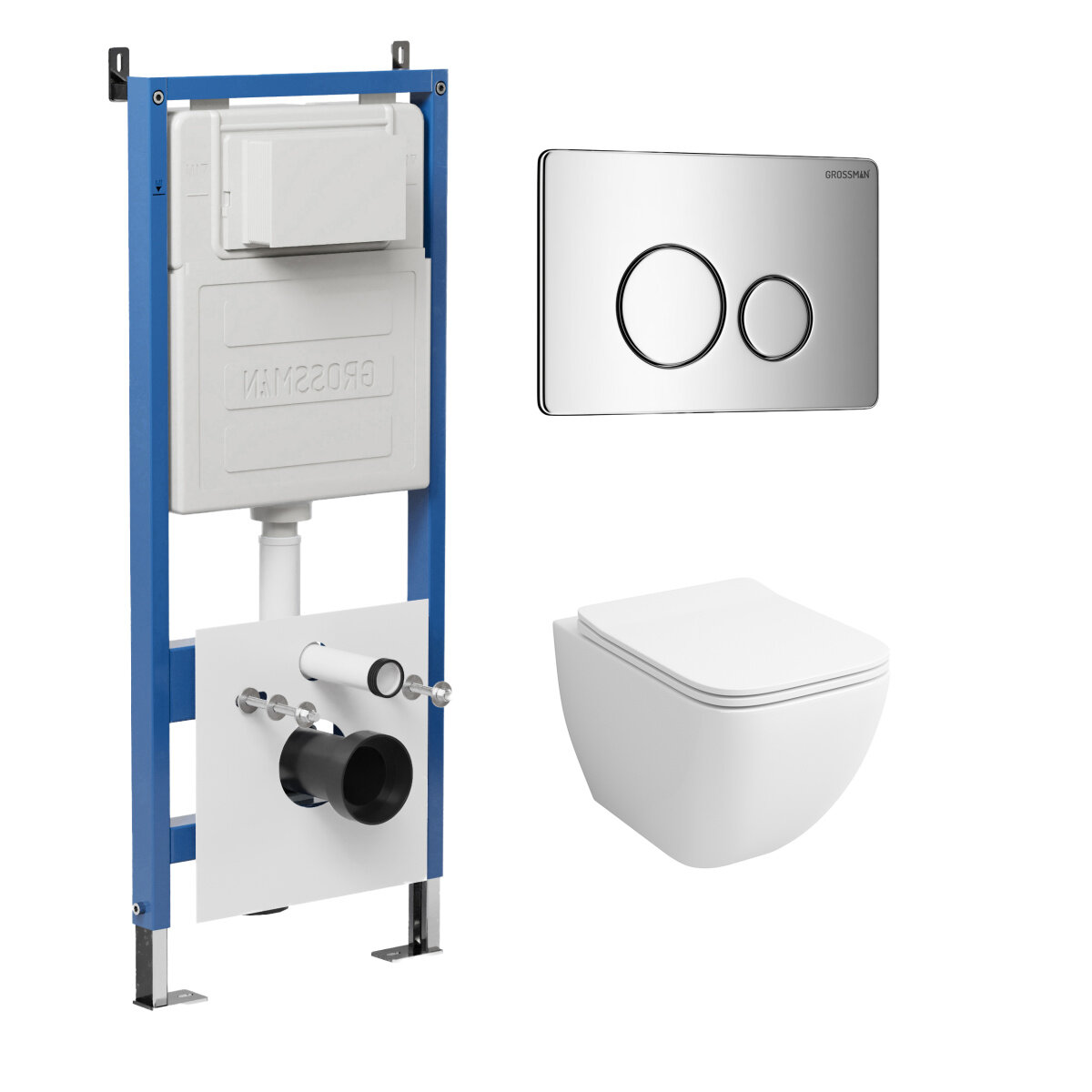 Комплект Унитаз подвесной с инсталляцией Grossman Style 97.4447S.05.10M безободковый, белый+ Кнопка смыва хром глянцевый