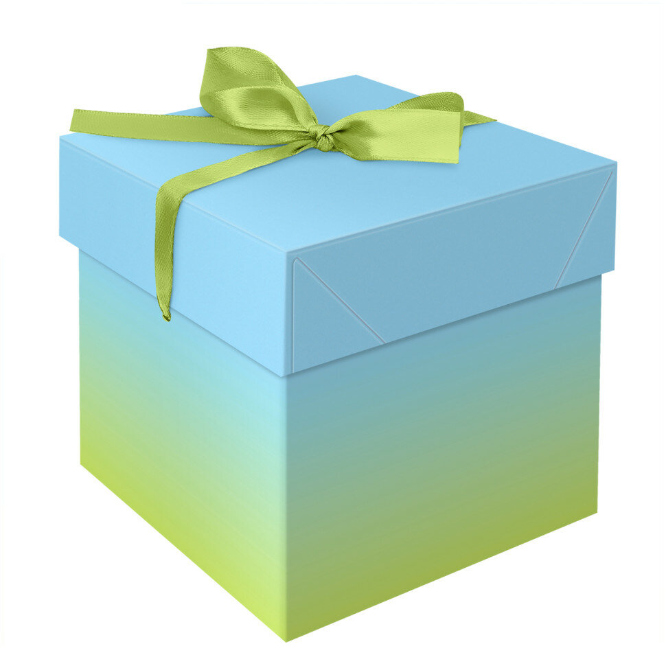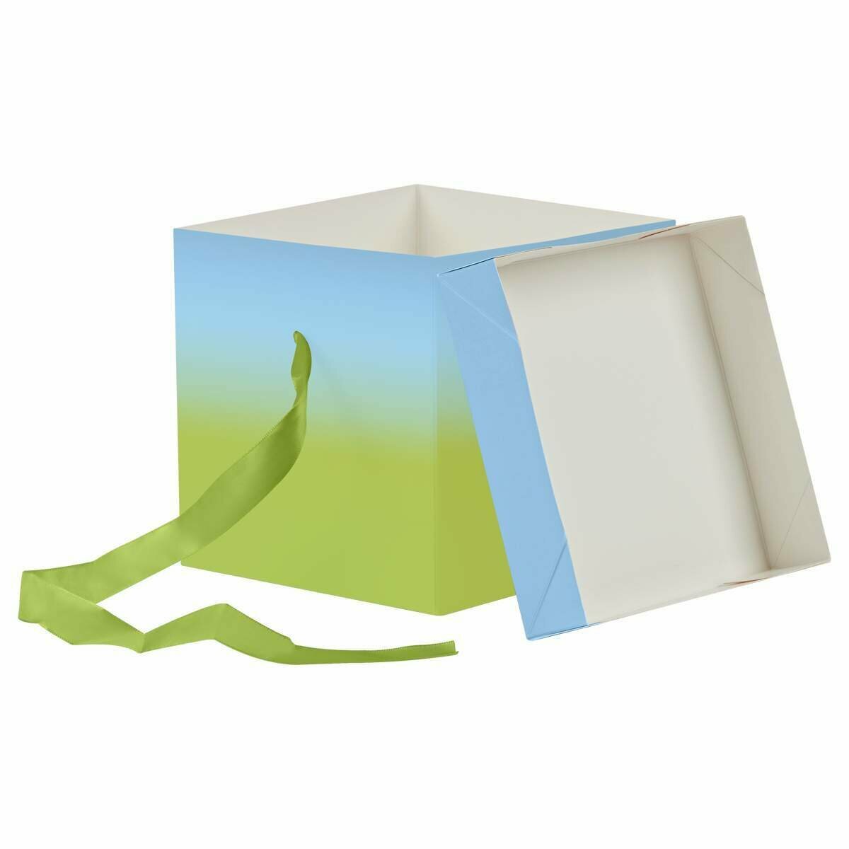 В дизайне используется нежный сине-зелёный градиент. Квадратная картонная коробочка размером 15*15*15 см также подходит для хранения мелочей.