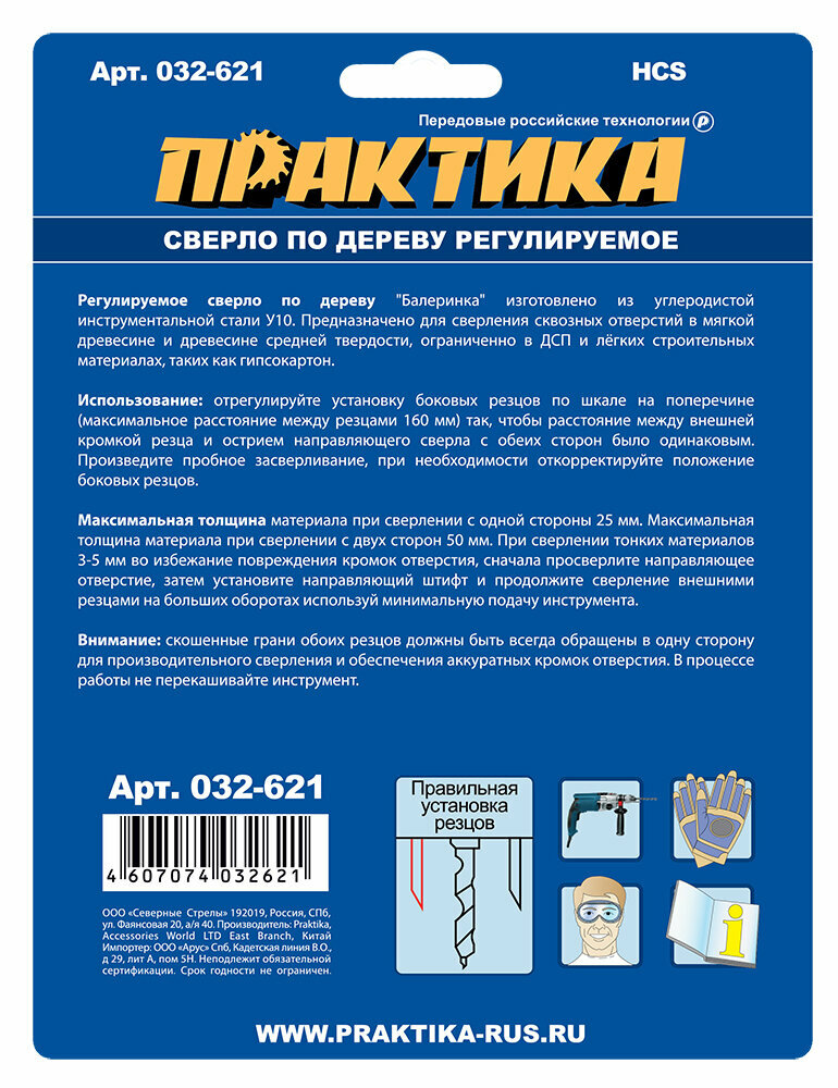 | Прочие особенности и свойства | Регулируемое сверло по дереву («балеринка») изготовлено из качественной углеродистой инструментальной стали. Предназначено для свеления сквозных отверстий в мягкой древесине и древесине средней твердости, ДСП и легких строительных материалах, таких как гипсокартон. Широкий рекомендуемый диапазон 30-120 мм позволяет сверлить отверстия под каналы электропроводки, сантехнические и вентиляционные трубы, электрические розетки. |