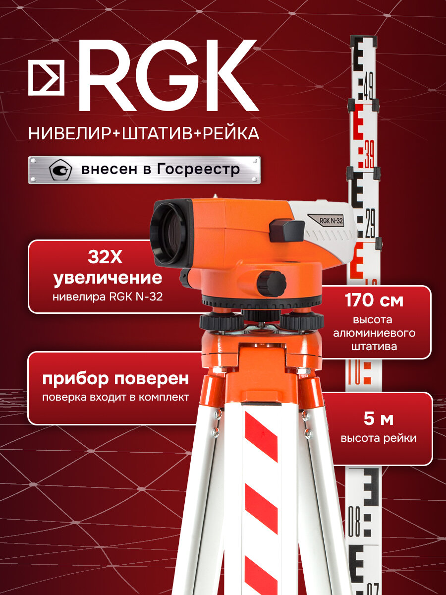 Комплект оптический нивелир RGK N-32 с поверкой + штатив S6-N + рейка AMO S5 (752503)