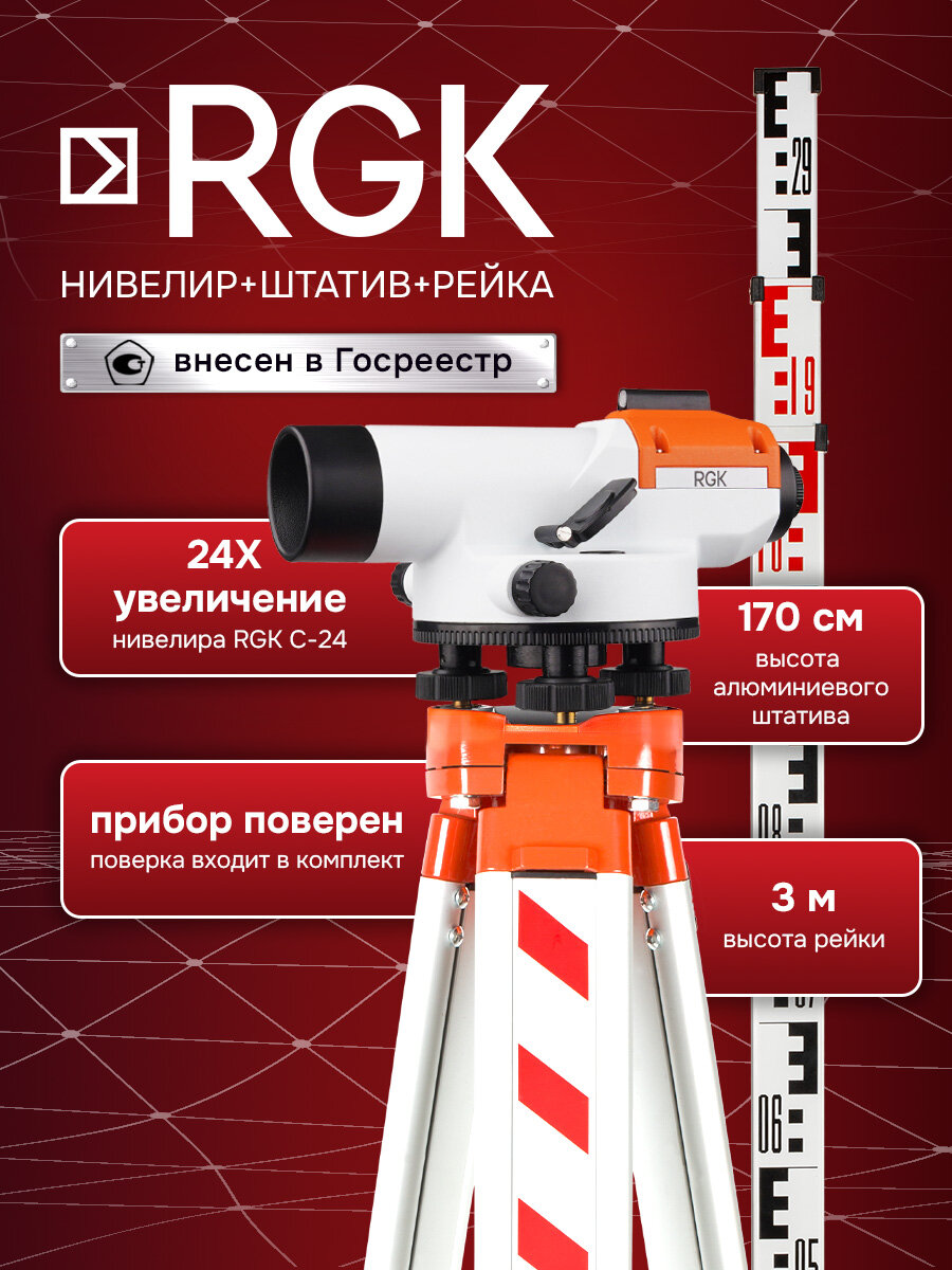 Комплект оптический нивелир RGK C-24 с поверкой + штатив S6-N + рейка AMO S3 (750035)