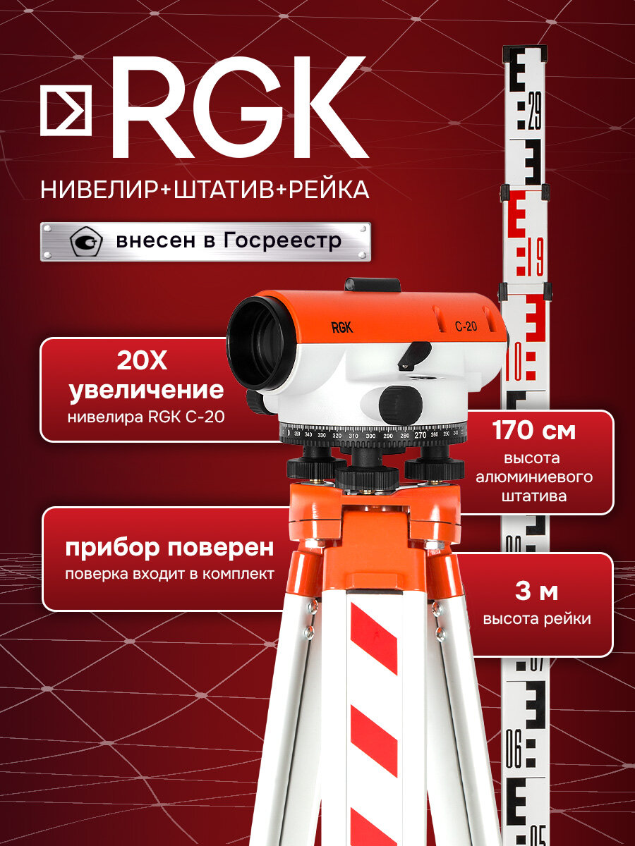 Комплект оптический нивелир RGK C-20 с поверкой + штатив S6-N + рейка AMO S3 (750028)