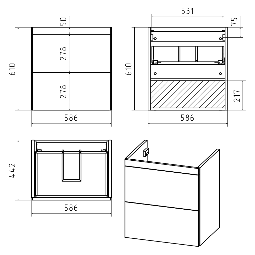 - Габариты корпуса тумбы (ШхВхГ): 586х610х442 мм.