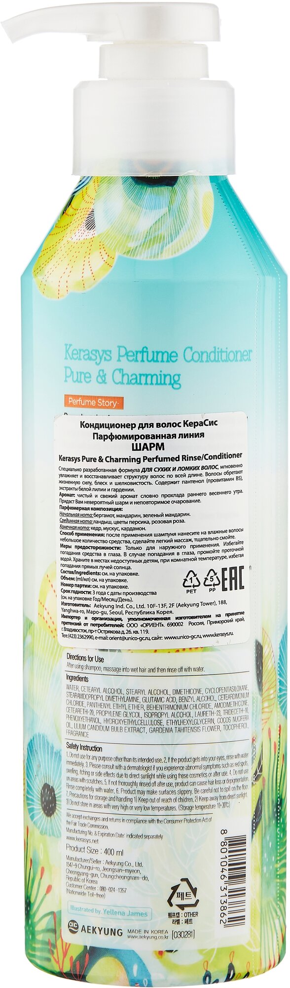 Кондиционер KeraSys Pure & Charming Perfumed Conditioner с эксклюзивным ароматом подчеркнет вашу индивидуальность. Имеет специально разработанную формулу для сухих и ломких волос. Мгновенно увлажняет и восстанавливает структуру волос по всей длине. Волосы обретают жизненную силу, блеск и шелковистость. Содержит пантенол, экстракты белой лилии и гардении. Имеет чистый и свежий аромат, который придаст вам невероятный шарм и неповторимое очарование.