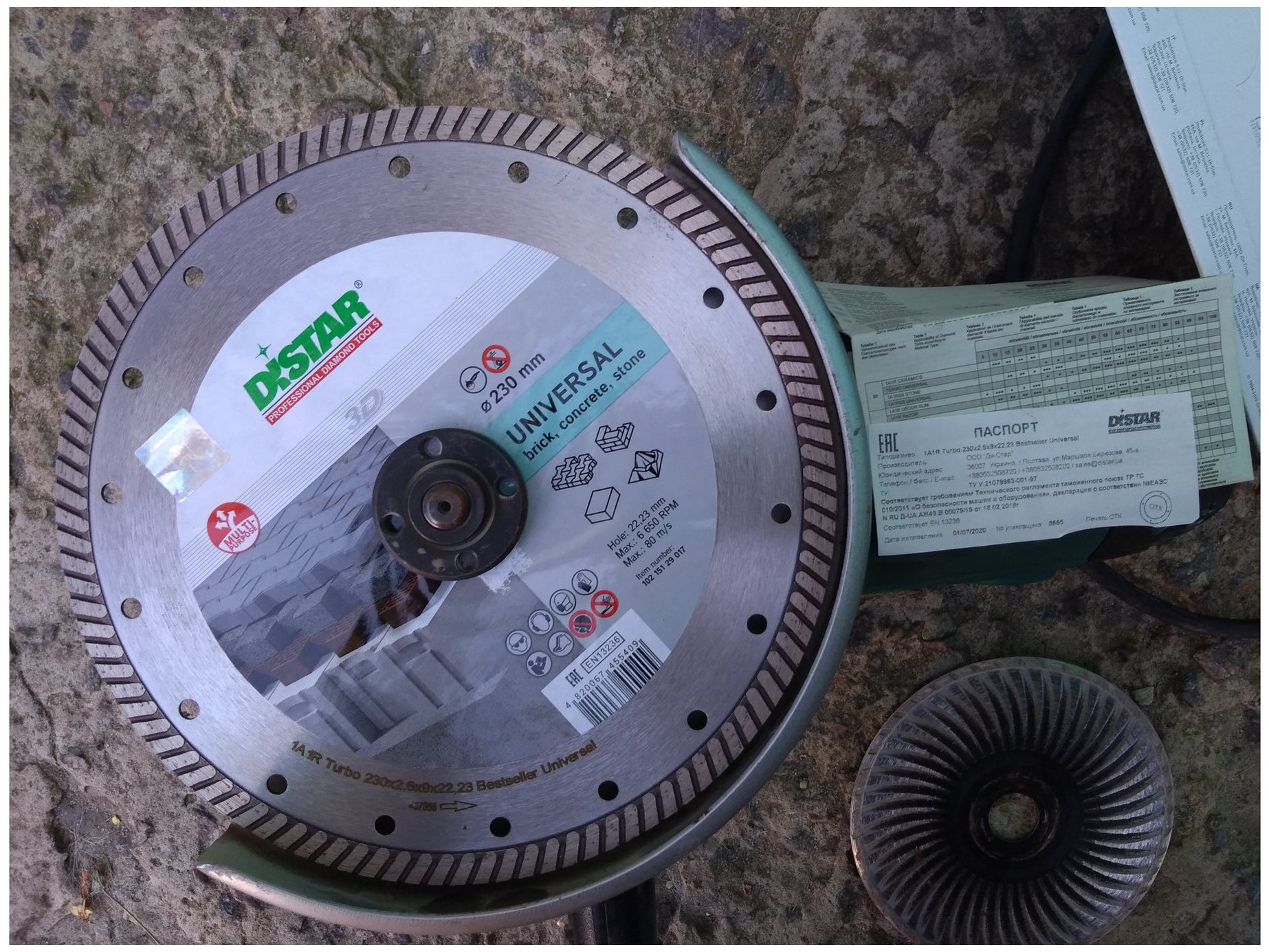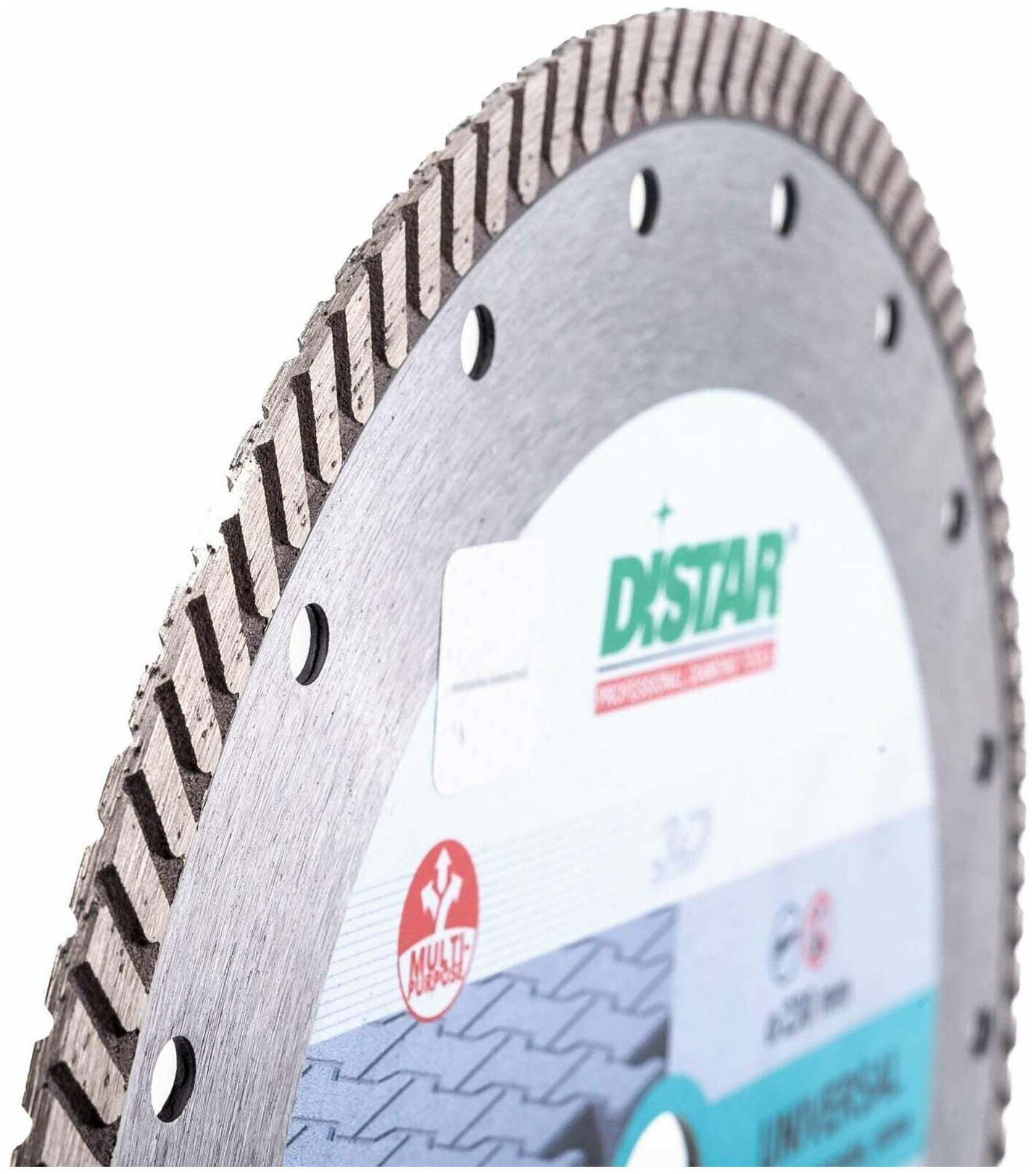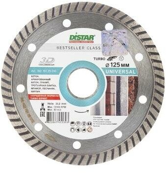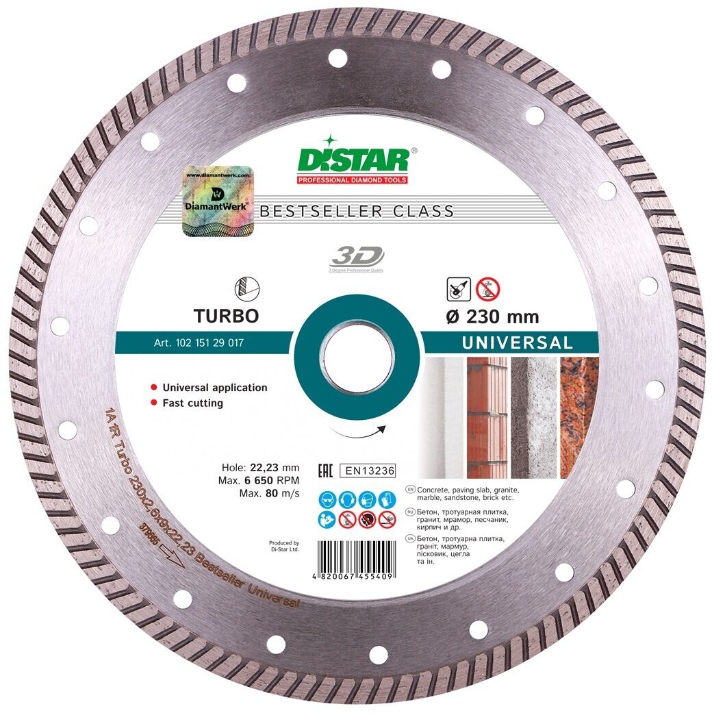 Алмазный круг Distar Turbo Bestseller Universal Это универсальный диск. Оптимально подходит для работы с различными материалами, такими как бетон, песчаник и тротуарная плитки. При этом также может применять для работы с кирпичом, цветными и черными гранитами. Оснащен прочным алмазным слоем специальной формы турбо сегментов в комбинации со стандартными гладкими, высота которого 12 мм, что позволяет выполнять максимально качественный рез со скоростью 0,35 погонных метров в минуту. Кроме того показывает достаточно большой ресурс работы, достигающий 60 метров. При тестировании на армированном бетоне марки М400, с армированием 6 шт. на метр, диск показал ресурс работы почти 30 метров, при скорости 0,3 м. Используется круг Distar Turbo Bestseller Universal на любых УШМ со стандартным посадочным посадочным местом 22,23 мм, при этом представлен в нескольких вариациях, от 115 до 232 миллиметров в диаметре.