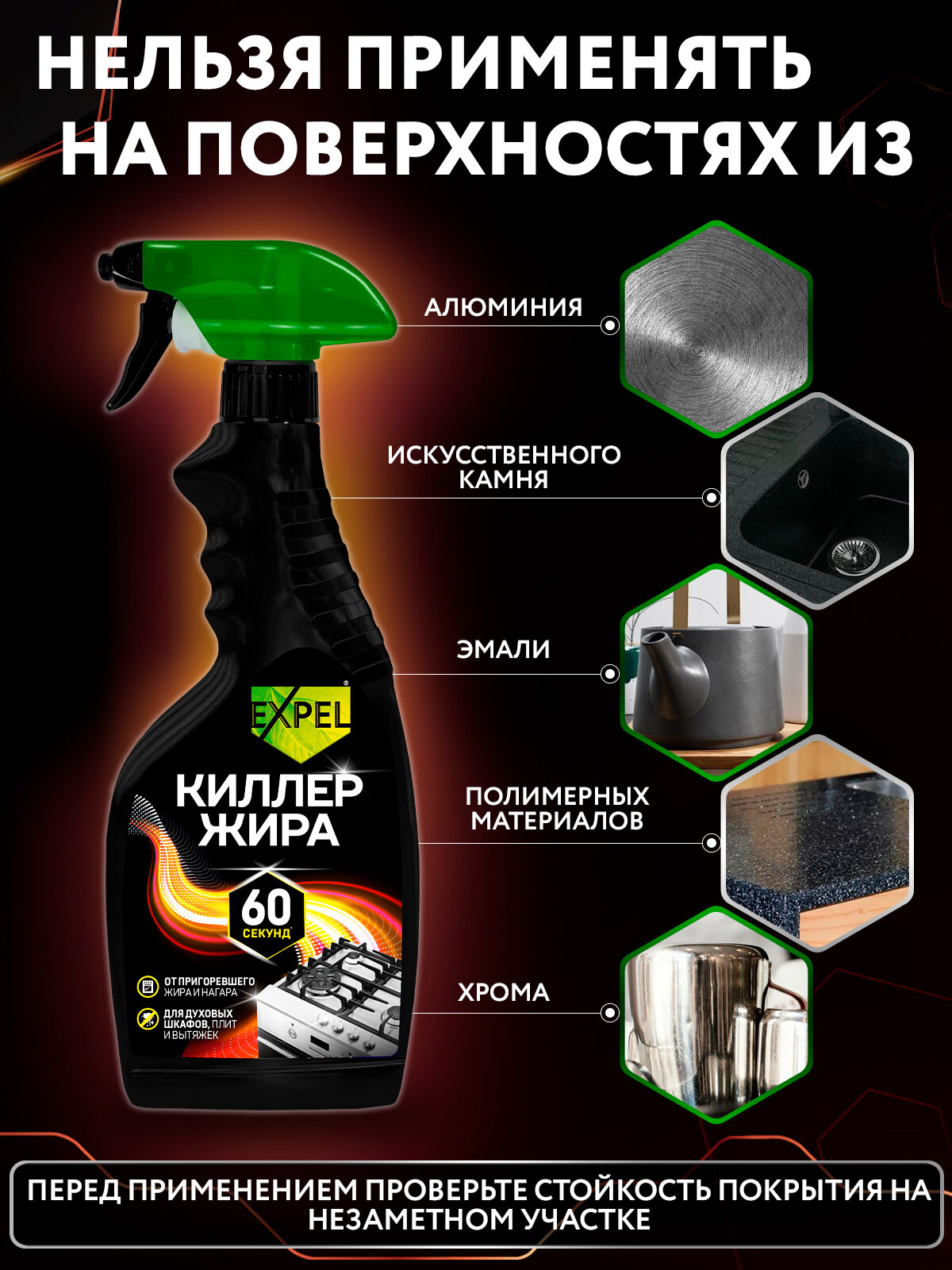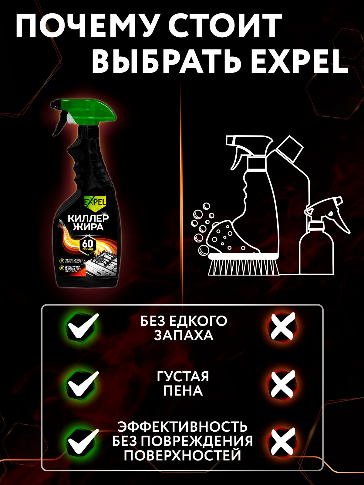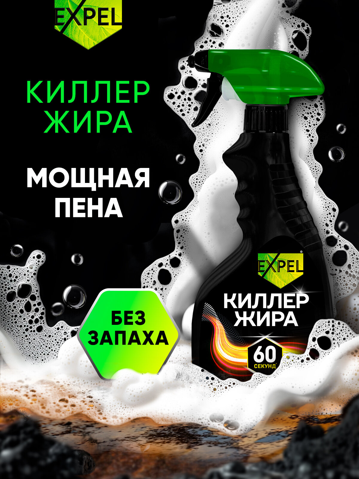 Expel Киллер Жира – это неотъемлемый помощник в борьбе с самыми трудными и застаревшими жировыми загрязнениями на вашей кухне !Благодаря своей мощной формуле и повышенному содержанию щелочных компонентов в составе, очиститель эффективно справляется со старым пригоревшим жиром, нагаром и копотью. Киллер Жира идеально подходит для очистки духовых шкафов, плит и вытяжек, обеспечивая безупречную чистоту на кухне. Удаляет жир, нагар, копоть и пригоревшую пищу с нержавеющих поверхностей, фаянса и стеклокерамики, а также с кухонных принадлежностей и посуды. Очистит кухонную плиту, фритюрницу, мультиварку, гриль, духовой шкаф и микроволновую печь даже от самых сложных загрязнений.Киллер Жира содержит активные вещества, расщепляющие жир, действие которых гарантирует быстрый результат без особых усилий. Очистит до блеска даже фритюрницу. Густая активная пена обеспечивает точное и безопасное нанесение на поверхность, проникает глубоко внутрь загрязнений и разрушает их изнутри. Видимый результат уже через 60 секунд! Современные разработки позволили сделать средство не только эффективным, но комфортным в использовании, поскольку очиститель не имеет резкого интенсивного запаха. Средство для кухни полностью смывается водой, не оставляет царапин и разводов. Доверьтесь очистителю для кухни Expel Киллер Жира и наслаждайтесь безупречной чистотой вашей кухни без лишних хлопот !Избегайте контакта средства с окрашенными и поврежденными поверхностями. Не допускайте попадания средства на поверхности из тефлона, цветных металлов (алюминий, медь, никелированные и хромированные детали), искусственного камня и других чувствительных к щелочи материалов. Перед применением проверьте устойчивость поверхности к средству на незаметном участке.