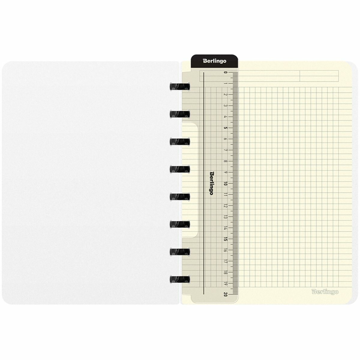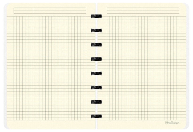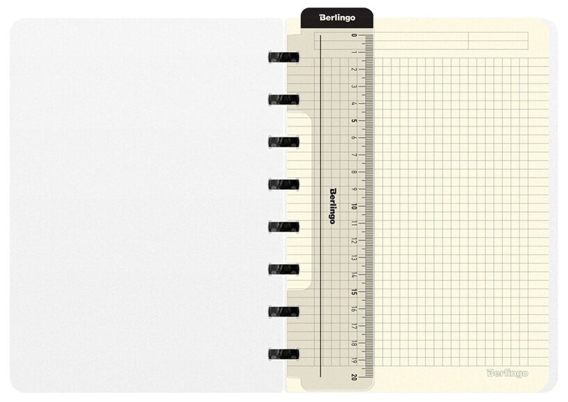 Бизнес-тетрадь содержит съемную брендированную линейку, которую можно использовать как закладку или разделитель и с легкостью можно перемещать в удобное место. Внутренний блок – высококачественная тонированная бумага, плотностью 80 г/м2, 80 листов в клетку, рамка для заголовка, темы или даты, поля с обеих сторон блока на каждом листе, линовка на вылет. Размер бизнес-тетради 220*160 мм, диаметр колец 22 мм.