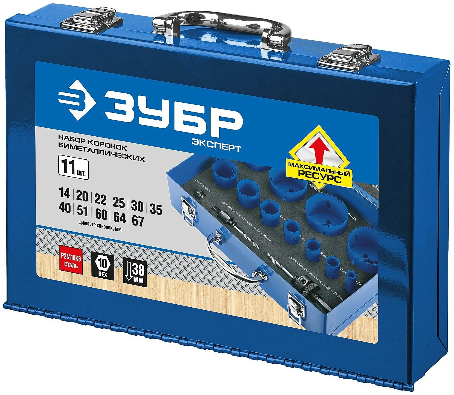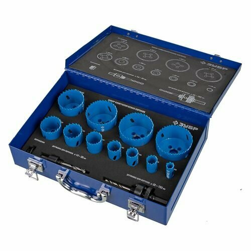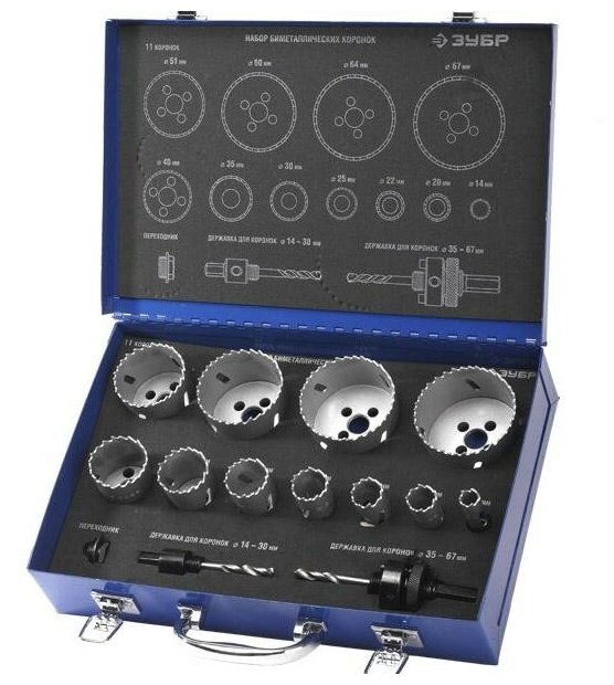 Биметаллическая коронка Зубр специально созданы для реализации самых сложных задач в строительстве и производстве при сверлении металла, дерева, ДСП, гипсокартона и твёрдых пластмасс. В наборе 11 штук (14,20,22,25,30,35,40,51,60,64,67).