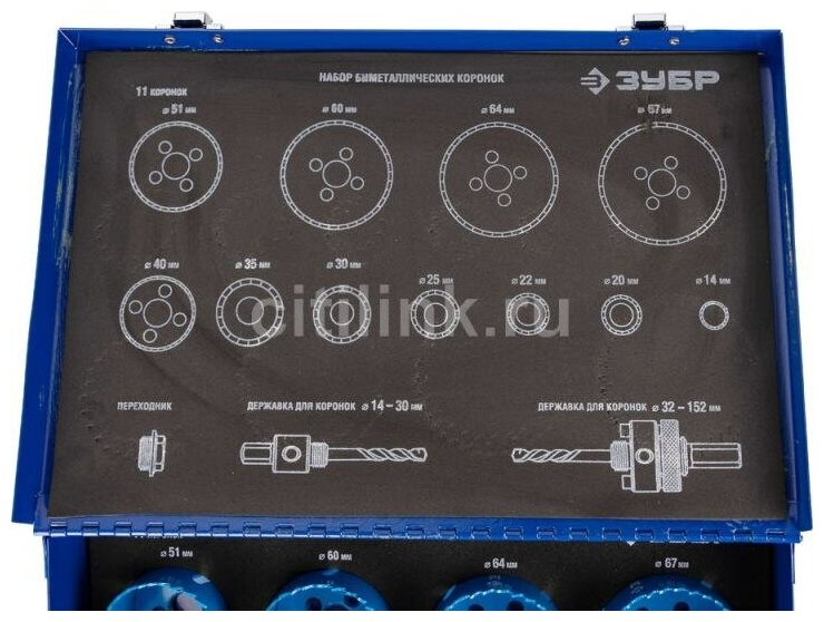 | Диаметр коронок в наборе, мм | 14, 20, 22, 25, 30, 35, 40, 51, 60, 64, 67 мм |