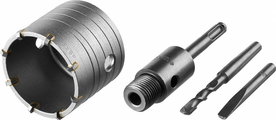 Буровая коронка ЗУБР с хвостовиком SDS Plus ( 2918-**_z01 ) Предназначена для просверливания отверстий большого диаметра в керамической облицовочной плитке, кирпиче, гипсовых плитах. Коронка имеет шесть твердосплавных резцов. В комплект входит державка с хвостовиком SDS Plus и центровочным сверлом с твердосплавной пластиной. При работе с перфоратором можно использовать функцию «сверление с ударом».