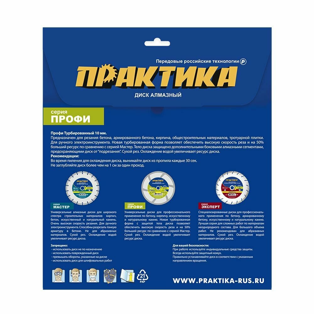 Садовый инструмент Практика 030-801 ПРАКТИКА 030-801 - предназначен для резания бетона, армированного бетона, кирпича, общестроительных материалов, тротуарной плитки. Сухой рез. Для ручного электроинструмента. Очень высокая скорость реза благодаря особой форме сегментов. Ресурс увеличен в два раза благодаря высоте сегмента 10 мм. Во время пиления для охлаждения диска, вынимайте диск из пропила каждые 30 секунд. Не заглубляйте диск более чем на 1 см за один проход.