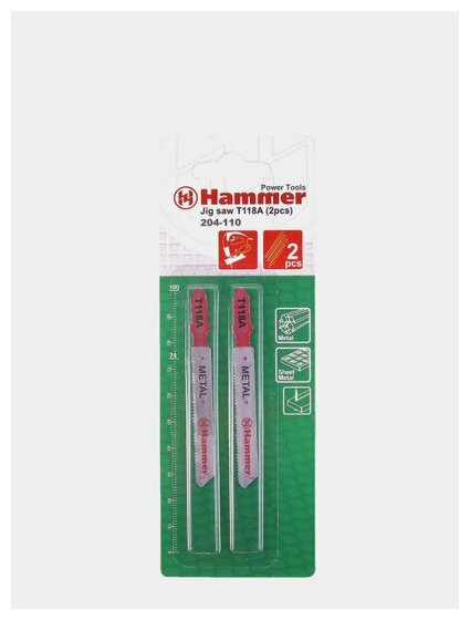 Пилка для лобзика Hammer Flex 204-110 JG MT T118A металл, 67мм, шаг 1.1-1.5, HSS, 2шт.Предназначены для пиления стали, цветных металлов, различных сплавов, а также пластмасс. — Изготовлены из качественной быстрорежущей стали HSS (High Speed Steel) и прослужат долго; — Остро заточенные, разведенные и отшлифованные зубья пилок обеспечивают точный рез; — Т-образный хвостовик совместим с большинством современных моделей электролобзиков.