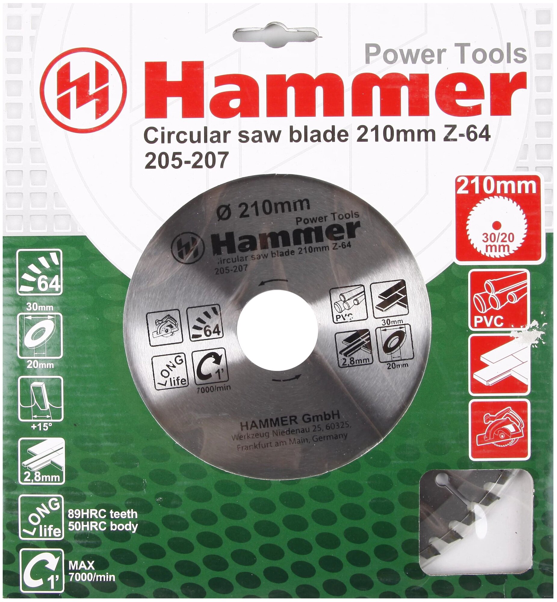 | Название на английском | Circular Saw Blade Hammer Flex 205-207 CSB PL 210мм*64*30/20мм laminate |