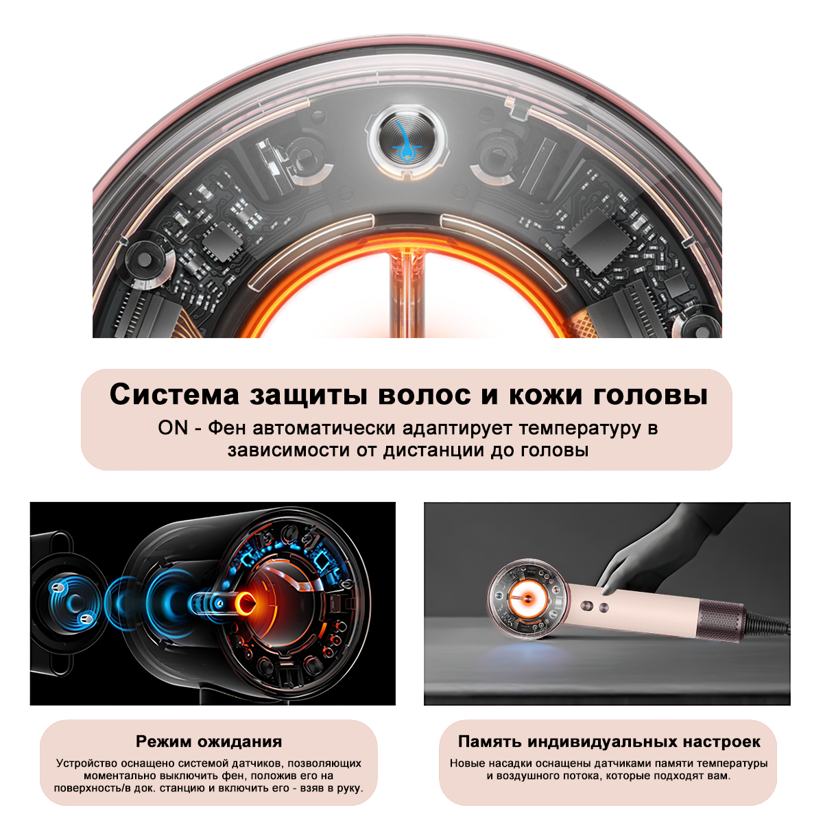 Благодаря технологии TOF-сенсоров, он точно определяет расстояние между феном и вашей головой, а искусственный интеллект автоматически регулирует температуру, защищая кожу и волосы от повреждений. Этот фен оснащен интеллектуальными датчиками, которые предотвращают излишнее тепловое воздействие не только на волосы, но и на кожу головы. При обнаружении перегрева устройство автоматически снижает температуру до 55 градусов Цельсия, корректируя поток воздуха для оптимальной безопасности. Для улучшения процесса сушки в фен встроен инфракрасный датчик, который позволяет устройству регулировать температуру в зависимости от расстояния до головы, поддерживая выбранный тепловой режим на любом расстоянии. Умный фен Supersonic Nural также оснащен небольшими светодиодами, меняющими цвет в режиме защиты кожи головы