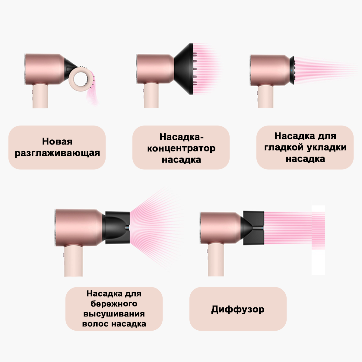 | Прочие насадки | насадка для разглаживания волос, насадка для бережного высушивания волос, насадка-диффузор |