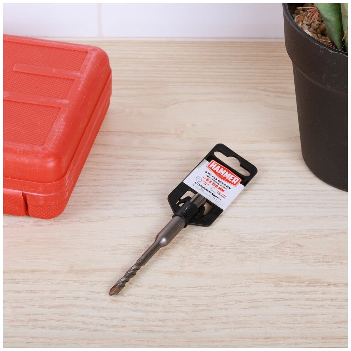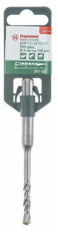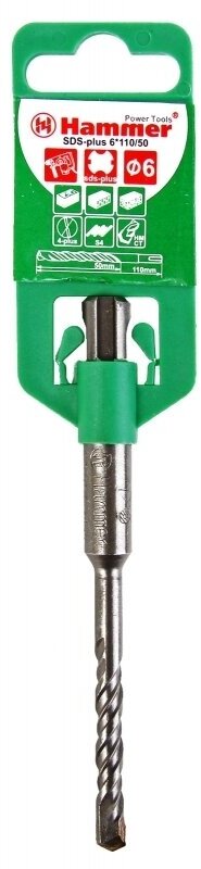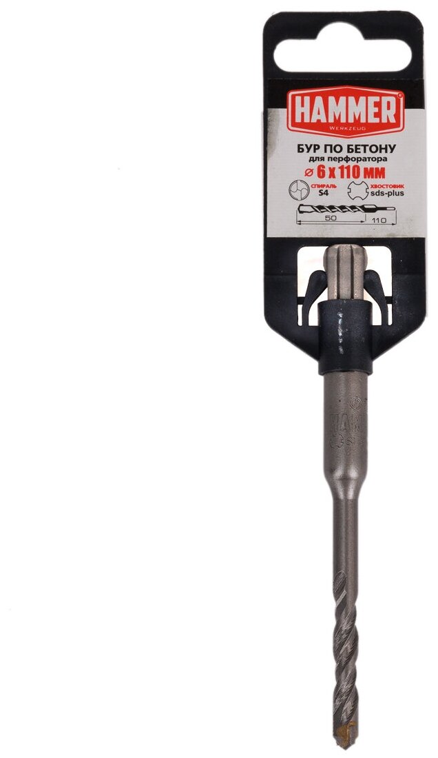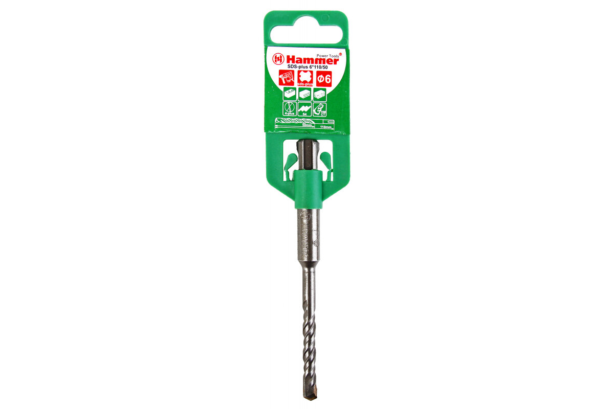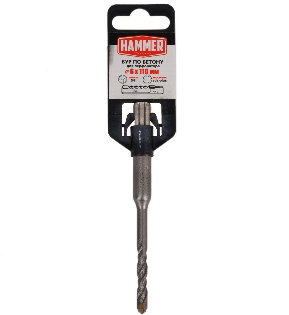 Бур Hammer Flex SDS+ 6х50/110ммПредназначены для сверления отверстий в бетоне, кирпичной кладке, искусственном и природном камне. — Твердосплавная напайка из твёрдого вольфрамокобальтового сплава BK8 обеспечивает высокий ресурс; — Двухканальная спираль обеспечивает легкий отвод стружки и низкий нагрев бура; — Изготовлен из высококачественной коррозионностойкой инструментальной стали — выдержит даже ударные нагрузки; — Использование смазки для буров позволяет снизить коэффициент трения и защитить бур от перегрева.