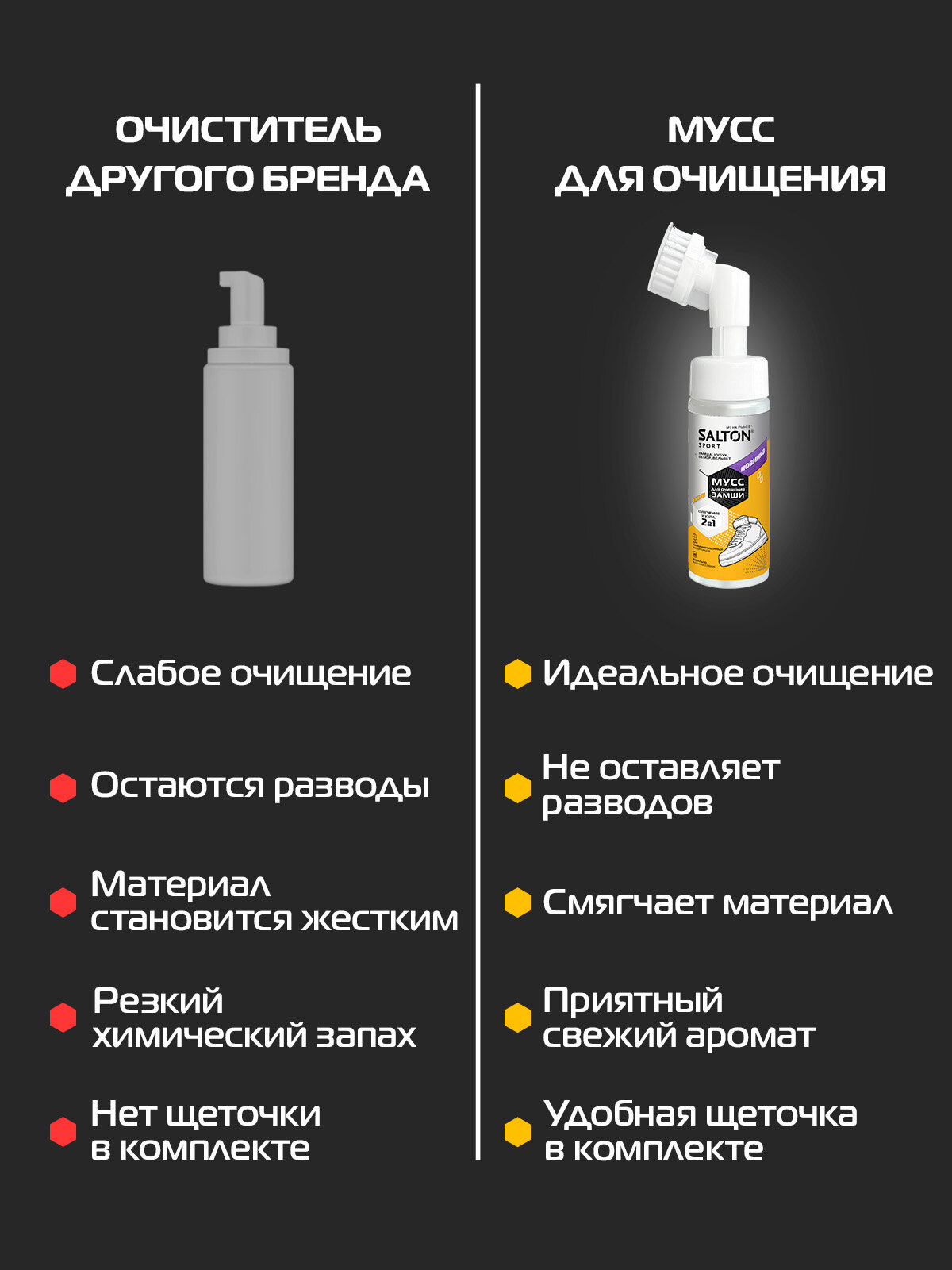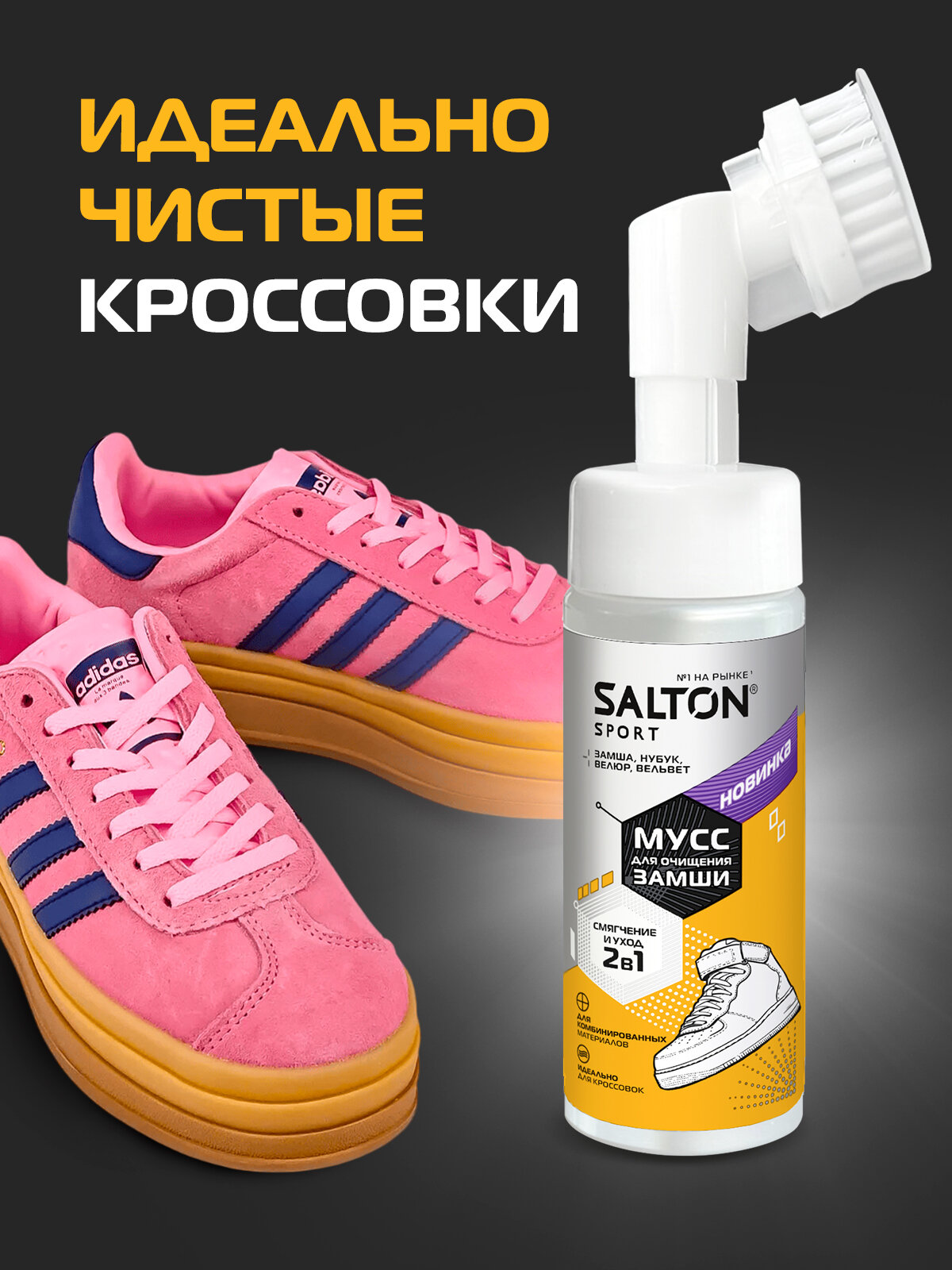 Мусс для очищения замши Salton Sport -идеальное решение для ухода за обувью и изделиями из замши, нубука и велюра !Ваша замшевая обувь или аксессуары нуждаются в особом уходе, чтобы сохранить свою красоту и долговечность. Мусс для очищения замши с удобной щеточкой создан специально для того, чтобы ваша любимая обувь и аксессуары выглядели безупречно. Это средство сочетает в себе деликатное очищение и уход, обеспечивая безупречный результат без риска повреждения материала.Легкая текстура мусса быстро проникает в структуру замши, нубука и велюра, эффективно удаляя даже самые стойкие загрязнения. Особый состав продукта включает компоненты, которые не только очищают, но и смягчают материал, предотвращая его пересыхание. Ваши замшевая обувь или аксессуары останутся мягкими и привлекательными на долгие годы.Щеточка, входящая в комплект, разработана с учетом особенностей деликатных материалов. Она мягко очищает поверхность, не повреждая ворс и не оставляя царапин. Этот аксессуар делает процесс ухода простым и удобным, обеспечивая равномерное нанесение мусса и тщательную обработку загрязненных участков.Это средство станет незаменимым помощником в вашем арсенале по уходу за обувью и аксессуарами.Применение мусса предельно просто: достаточно удалить пыль и сухую грязь с поверхности обуви или вещи, нанести средство на загрязнение, аккуратно потереть щеточкой и дать высохнуть при комнатной температуре. В завершение, при необходимости, поднимите ворс щеткой для замши. Мусс не требует смывания водой, что делает его использование быстрым и комфортным.С этим муссом ваши обувь и аксессуары всегда будут выглядеть свежими и ухоженными, независимо от погодных условий и интенсивности носки. Позаботьтесь о своей замшевой обуви с легкостью и удовольствием вместе с Salton Sport!