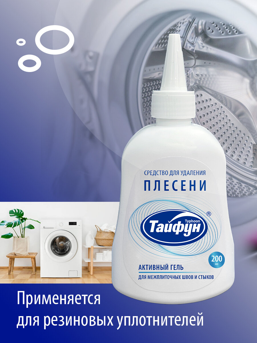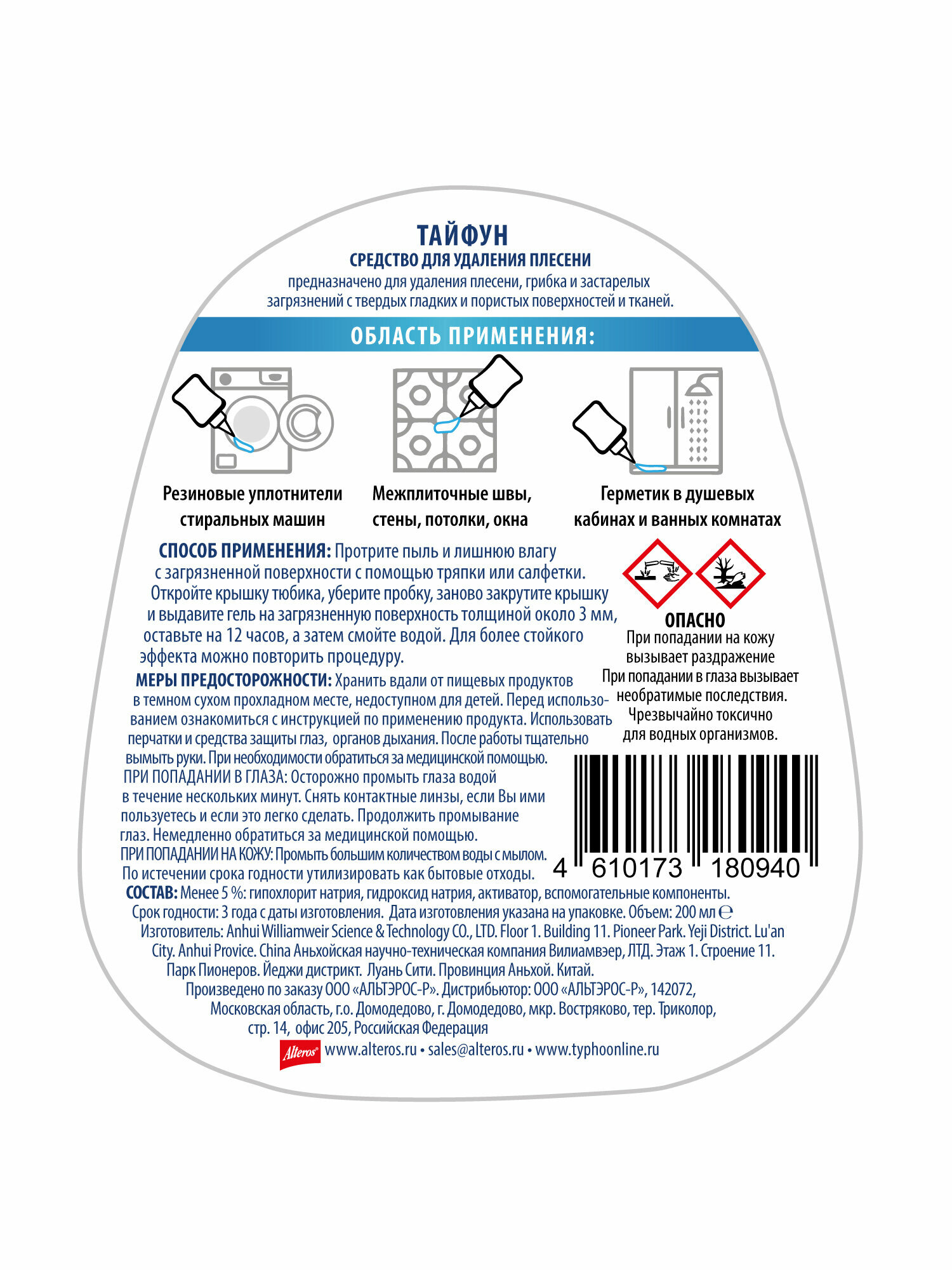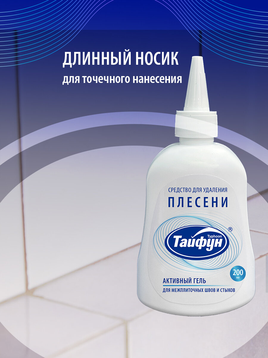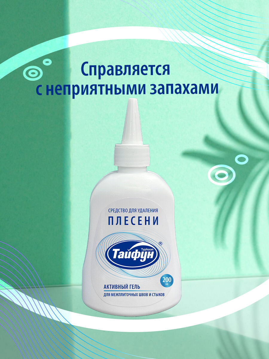 Тайфун Средство для удаления плесени, 200мл. Уничтожает плесень, грибы, бактерии. Придает гигиеническую чистоту. Справляется с неприятными запахами. Применяетcя для стен, полов, потолков, раковин, унитазов, межплиточных швов, лотков домашних животных, отсеков стиральных машин, душевых кабин. Средство содержит активный хлор. Перед применением проверьте стойкость материалов на незаметном участке. Встряхните флакон. Поверните колпачок в рабочее положение. С расстояния 20-30 см нанесите средство на плесень и загрязнения и оставьте на 5-10 минут, затем смойте. При необходимости повторите процедуру.