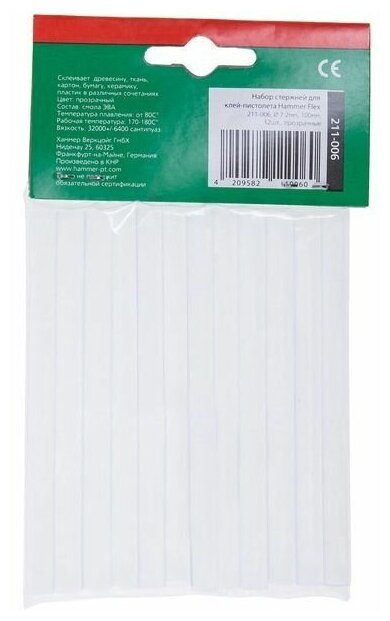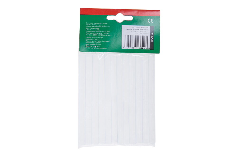 Набор стержней для клей-пистолета Hammer 211-006 7.2мм, 100мм, 12шт., прозрачные Клеевые стержни предназначены для герметизации, монтажа и соединения большинства строительных материалов. — Cтандартный диаметр стержня подойдет к большинству моделей клеевых пистолетов; — Можно использовать для: • склеивания дерева, керамики, ДСП, пластиков; • заделки окон, швов плитки, герметизации сантехнических соединений; • реставрации книжных переплетов, ремонта обуви и ковровых покрытий.
