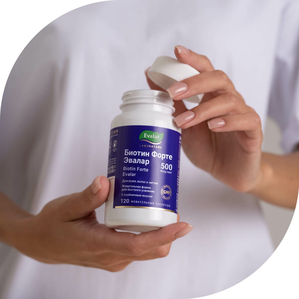 Первый биотин в удобной форме жевательных таблеток с клубничным вкусом. Жевательная форма обеспечивает быстрое усвоение. Высокая концентрация 500 мкг в 1 таблетке.