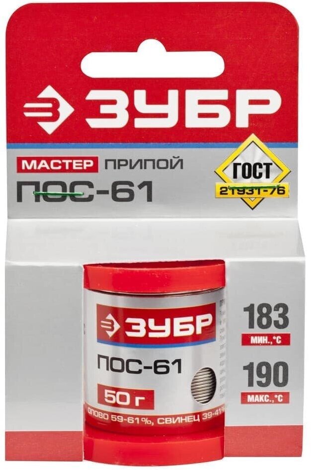 Припой для пайки ЗУБР , предназначен для проведения паяльных работ. Лужение и пайка элементов электро- и радиоаппаратуры, печатных схем, точных приборов с высокогерметичными швами, где недопустим перегрев; пайка жести, обмоток электрических машин, монтажных элементов, моточных и кабельных изделий, радиаторов и листового цинка, оцинкованных деталей холодильных агрегатов, теплообменников, электроламп, кабельных оболочек, тонколистовой упаковки. Применяется при пайке изделий из меди, цинка, железа.