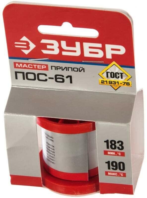 Припой ЗУБР 100гр 1мм проволока пос 61 ()Модель - Технические характеристики:-Форма: Проволока -Диаметр: 1 мм-Температура пайки: 183-190 °CПрипой ПОС 61 Зубр применяется для лужения и пайки элементов электро- и радиоаппаратуры, печатных схем, точных приборов с герметичными швами, где недопустим перегрев, пайка жести, обмоток электрических машин, монтажных элементов, моточных и кабельных изделий, радиаторов и листового цинка, оцинкованных деталей холодильных агрегатов, теплообменников, электроламп, кабельных оболочек, тонколистовой упаковки. Припой с 61% содержанием олова и 39% содержанием свинца оптимально подходит в случаях, когда элементы для спайки нельзя перегревать. Продукция предназначена для профессионального использования. Припой имеет высший уровень качества и прошёл спектральную и химическую проверку. Соответствует ГОСТ 21931-76.Преимущества:-Изделия прошли спектральную и химическую проверку. Подлинность химического состава подтверждена ФБУ «ростест-москва»;-Продукция предназначена для профессиональногоиспользования;-Продукция соответствует ГОСТ 21931-76;-Высокая смачиваемость и растекаемость;-Низкая дымность и отсутствие едкого запаха;-Не разбрызгивается в процессе пайки;