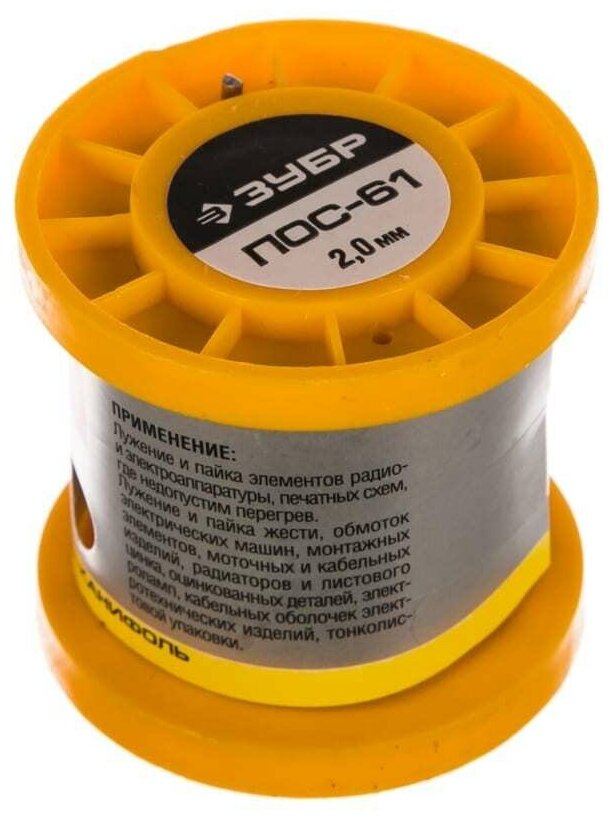 Припой ПОС 61 Зубр применяется для лужения и пайки элементов электро- и радиоаппаратуры, печатных схем, точных приборов с герметичными швами, где недопустим перегрев, пайка жести, обмоток электрических машин, монтажных элементов, моточных и кабельных изделий, радиаторов и листового цинка, оцинкованных деталей холодильных агрегатов, теплообменников, электроламп, кабельных оболочек, тонколистовой упаковки. Припой с 61% содержанием олова и 39% содержанием свинца оптимально подходит в случаях, когда элементы для спайки нельзя перегревать. Продукция предназначена для профессионального использования. Припой имеет высший уровень качества и прошёл спектральную и химическую проверку. Соответствует ГОСТ 21931.