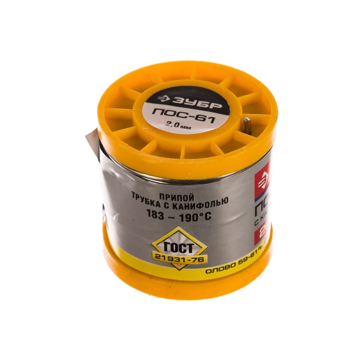 Припой ПОС 61 Зубр применяется для лужения и пайки элементов электро- и радиоаппаратуры, печатных схем, точных приборов с герметичными швами, где недопустим перегрев, пайка жести, обмоток электрических машин, монтажных элементов, моточных и кабельных изделий, радиаторов и листового цинка, оцинкованных деталей холодильных агрегатов, теплообменников, электроламп, кабельных оболочек, тонколистовой упаковки. Припой с 61% содержанием олова и 39% содержанием свинца оптимально подходит в случаях, когда элементы для спайки нельзя перегревать. Продукция предназначена для профессионального использования. Припой имеет высший уровень качества и прошёл спектральную и химическую проверку. Соответствует ГОСТ 21931.
