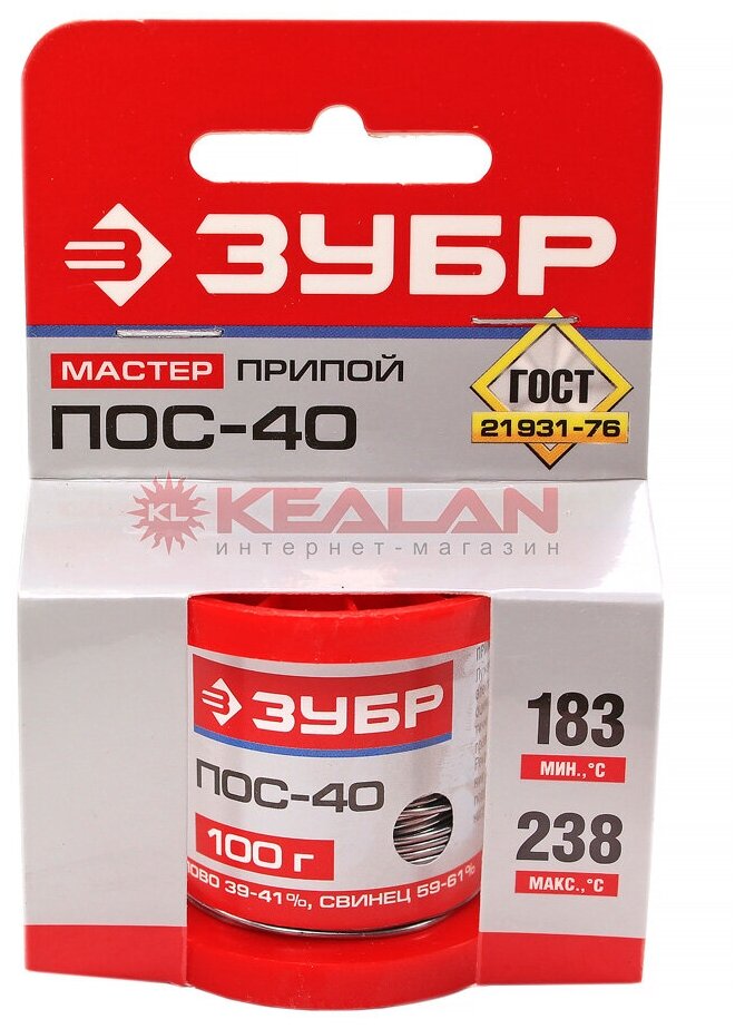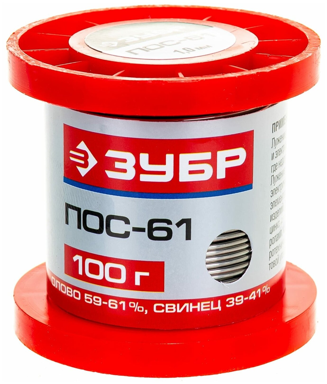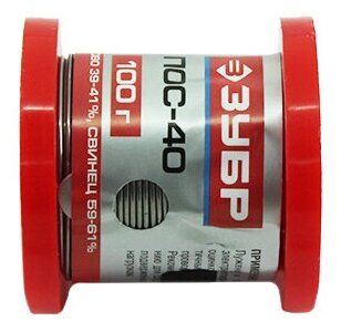Припой ЗУБР 100гр 1мм проволока пос 40 ()Модель - Технические характеристики:-Форма: Проволока -Диаметр: 1 мм-Температура пайки: 183–238 °CПрипой ПОС 40 Зубр применяется для пайки элементов электроаппаратуры: диодов, транзисторов, конденсаторов, микросхем и др, также припой может использоваться для пайки деталей из оцинкованного железа с герметичными швами, медных проводов и латуни, соединения элементов, подверженных вибрационным нагрузкам. Припой с 40% содержанием олова и 60% содержанием свинца оптимально подходит в случаях, когда элементы для спайки нельзя перегревать. Продукция предназначена для профессионального использования. Припой имеет высший уровень качества и прошёл спектральную и химическую проверку. Соответствует ГОСТ 21931-76.Преимущества:-Изделия прошли спектральную и химическую проверку. Подлинность химического состава подтверждена ФБУ «ростест-москва»;-Продукция предназначена для профессиональногоиспользования;-Продукция соответствует ГОСТ 21931-76;-Высокая смачиваемость и растекаемость;-Низкая дымность и отсутствие едкого запаха;-Не разбрызгивается в процессе пайки;