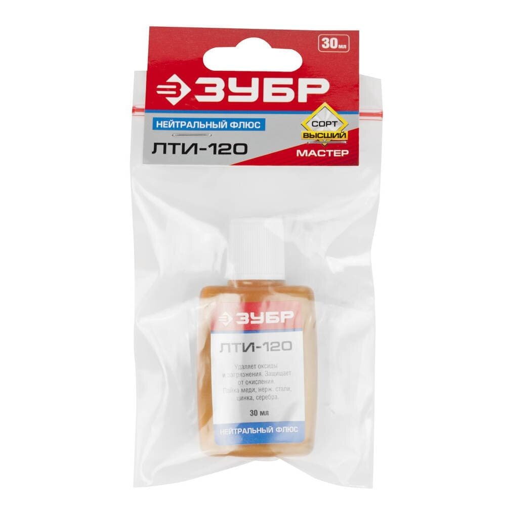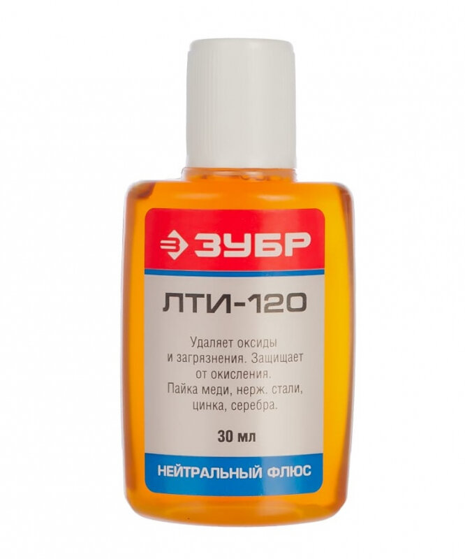 Флюс ЛТИ-120 Зубр применяется для пайки элементов радиомонтажа и печатных плат легкоплавкими припоями. Не требует отмывки. Растворяется спиртом, ацетоном.Преимущества Защищает от окисления поверхность нагреваемого металла и расплавленный припой, улучшая качество пайки Подходит для пайки легкоплавких припоев, обеспечивая надёжное соединение Не требует отмывки после использования, что упрощает процесс пайки Прост в использовании, удобен для работы с различными компонентами и поверхностями