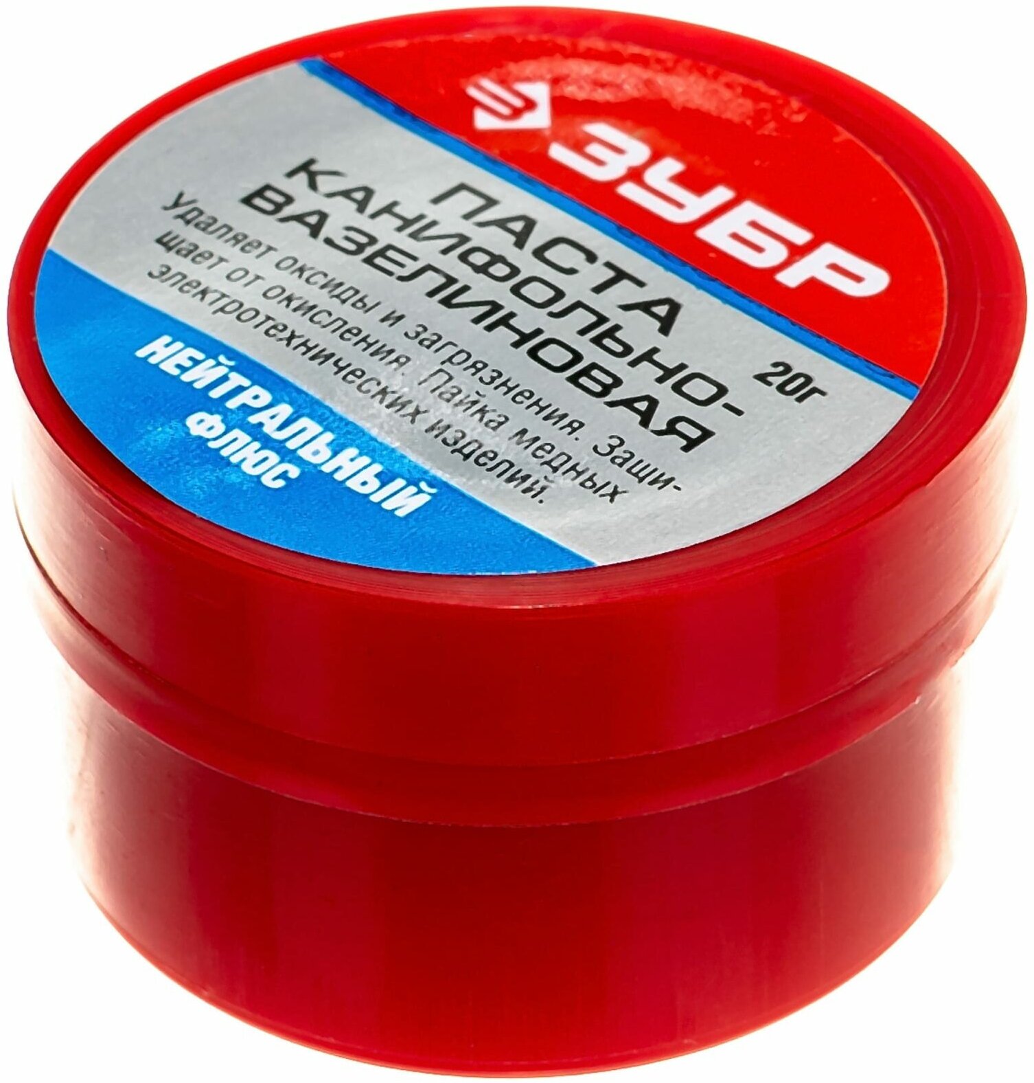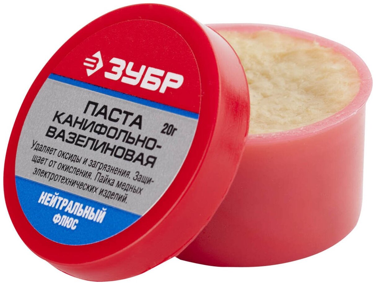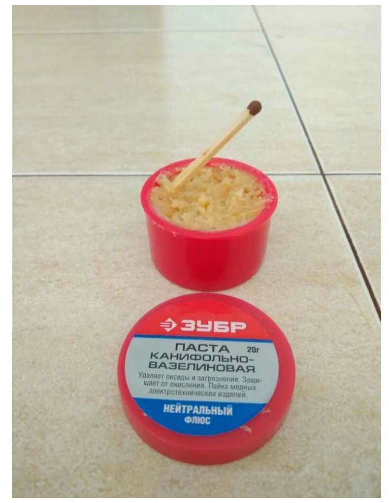 Паста паяльная канифольно-вазелиноваяЗубр используется в виде флюса при производстве паяльных работ. Флюсы предназначены для удаления окислов с поверхности под пайку, снижения поверхностного натяжения, улучшения растекания жидкого припоя и защиты от действия окружающей среды. Во время пайки они защищают от окисления поверхность нагреваемого металла и расплавленный припой. Это способствует улучшению качества пайки. Преимущества Пайка печатных плат и радиокомпонентов. Отлично растворяют и удаляют оксиды и загрязнения с поверхности паяемого соединения Защищает от окисления поверхность нагреваемого металла и расплавленный припой, улучшая качество пайки пайка элементов радиомонтажа и печатных плат легкоплавкими припоями при температурах 200–300°C. Не требует отмывки. Растворяется спиртом, ацетоном