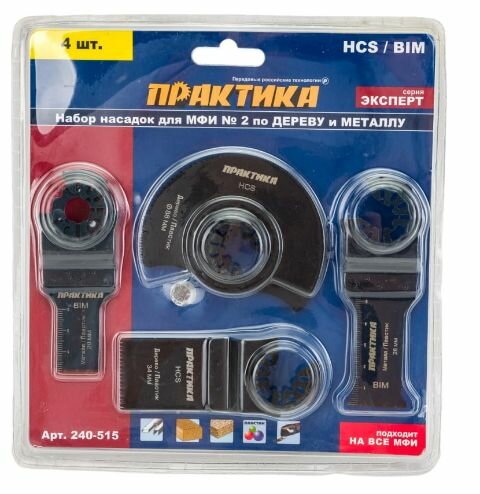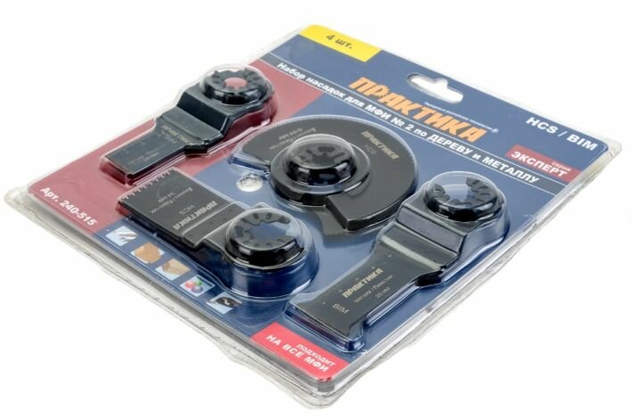 Набор насадок №2 для МФИ комбинированный (4 шт.) ПРАКТИКА используется совместно с многофункциональным инструментом. Применяется при обработке металлических, деревянных изделий, фанеры, пластика, гипсокартона.Преимущества Набор включает четыре насадки, позволяющие производить различные виды работ: выборка пазов, подрезание внутренних углов, вырезание проемов, резка плинтусов, труб, профилей и т.д. Две насадки изготовлены из биметалла, две - из высокоуглеродистой инструментальной стали