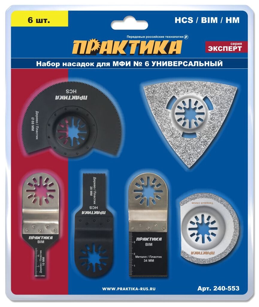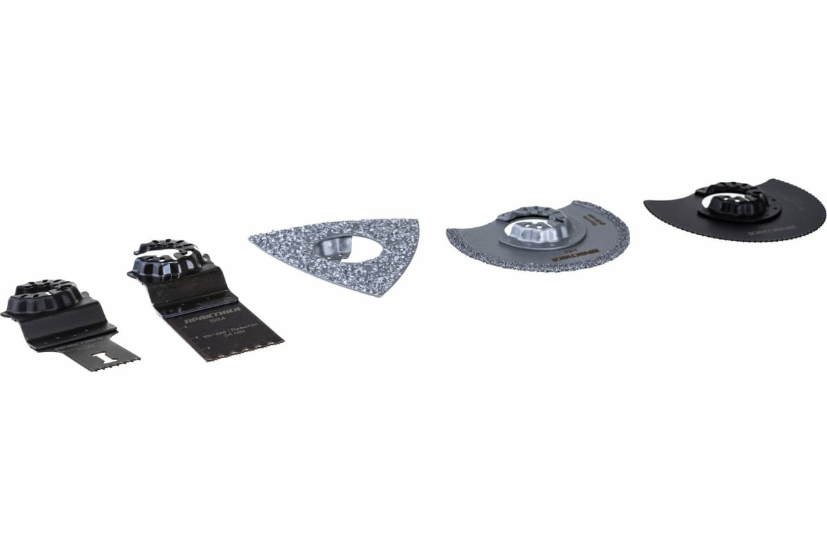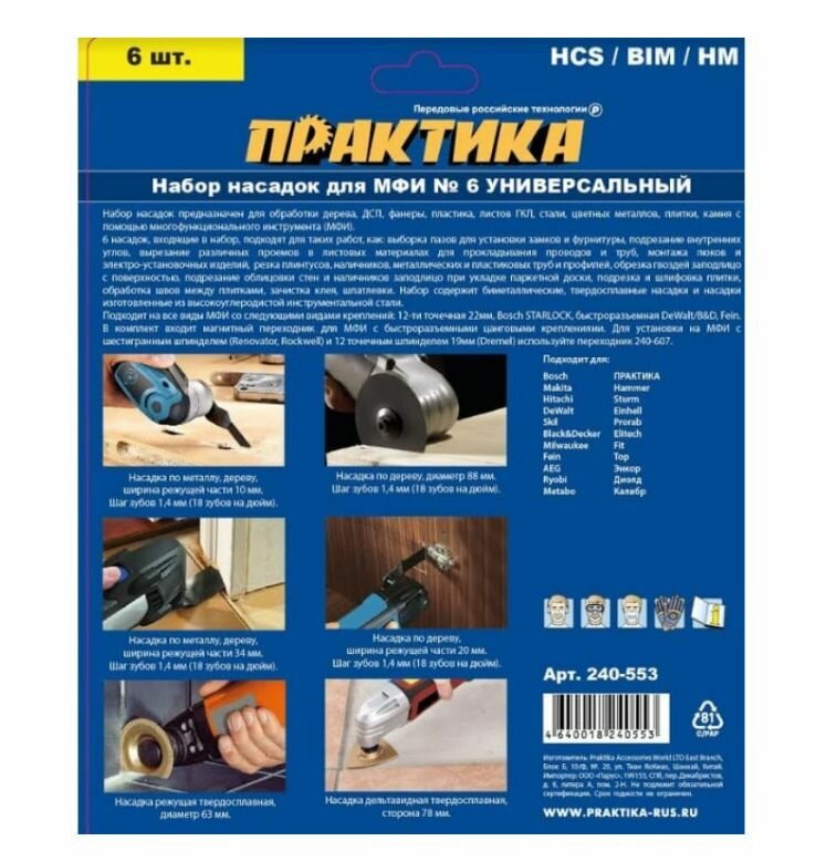 Набор насадок предназначен для обработки дерева, ДСП, фанеры, пластиков, листов ГКЛ, стали, цветных металлов, плитки, камня с помощью многофункционального инструмента (МФИ). Набор содержит 6 насадок позволяющие производить следующие виды работ: выборка пазов для установки замков и фурнитуры, подрезание внутренних углов, вырезание различных проемов в листовых материалах под провода, трубы, люки, электро-установочные изделия, резка плинтусов, наличников, металлических и пластиковых труб и профилей, обрезка гвоздей заподлицо с поверхностью, подрезание облицовки стен и наличников заподлицо при укладке паркетной доски, подрезка и шлифовка плитки, обработка швов между плитками, зачистка клея, шпатлевки.