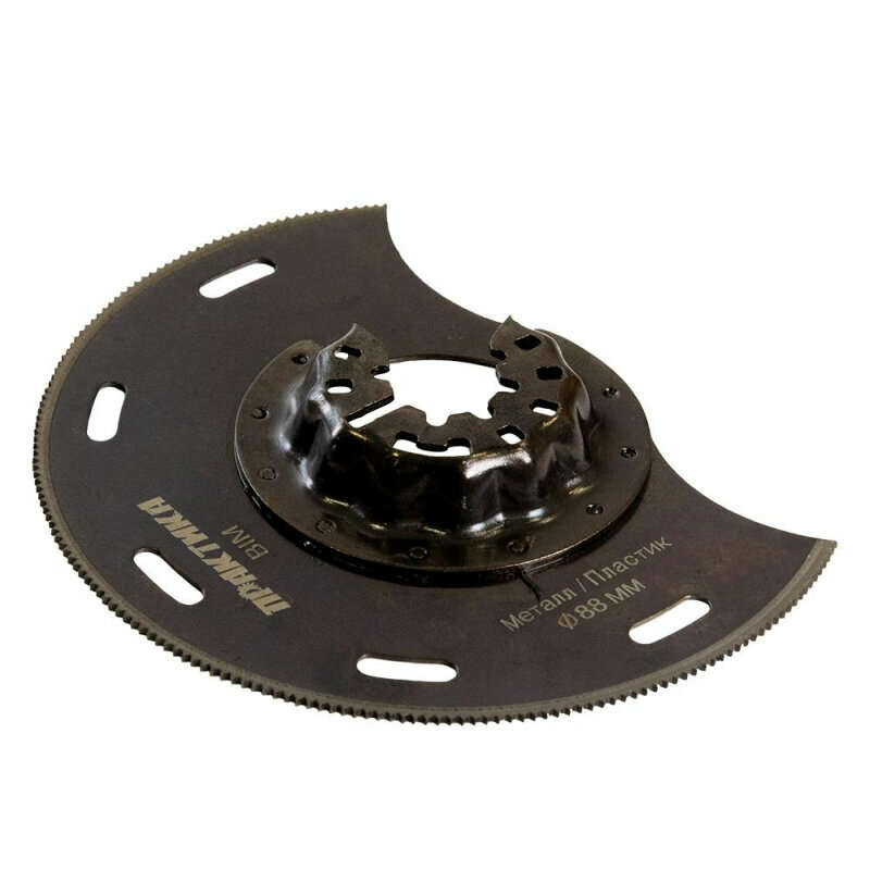 Насадка режущая предназначена для обработки стали, цветных металлов, дерева, ДСП, пластиков с помощью многофункционального инструмента (МФИ). Насадка наиболее удобна для выполнения таких работ как: прямолинейное резание кузовного металла автомобилей, металлочерепицы, ДСП и фанеры, отрезание металлических и пластиковых труб, профилей, плинтусов, наличников, балясин, подрезание облицовки стен и наличников заподлицо при укладке паркетной доски, вырезание больших проемов в листовых материалах под провода, трубы, люки. Биметаллическое полотно насадки изготовлено из высококачественной инструментальной стали с зубьями из быстрорежущей стали. Диаметр: 88 мм. Глубина врезания: до 23 мм. Шаг зубов: 1,4 мм (18 зубов на дюйм).