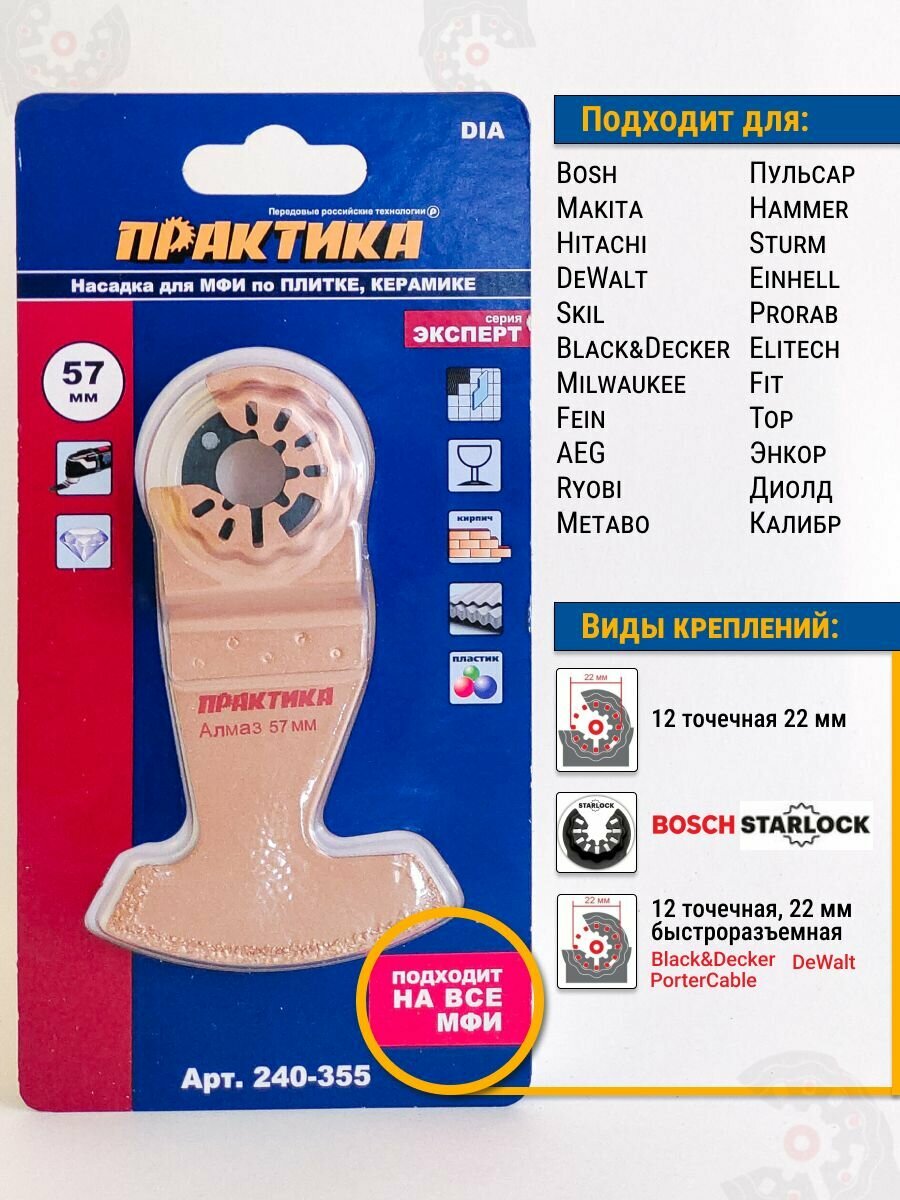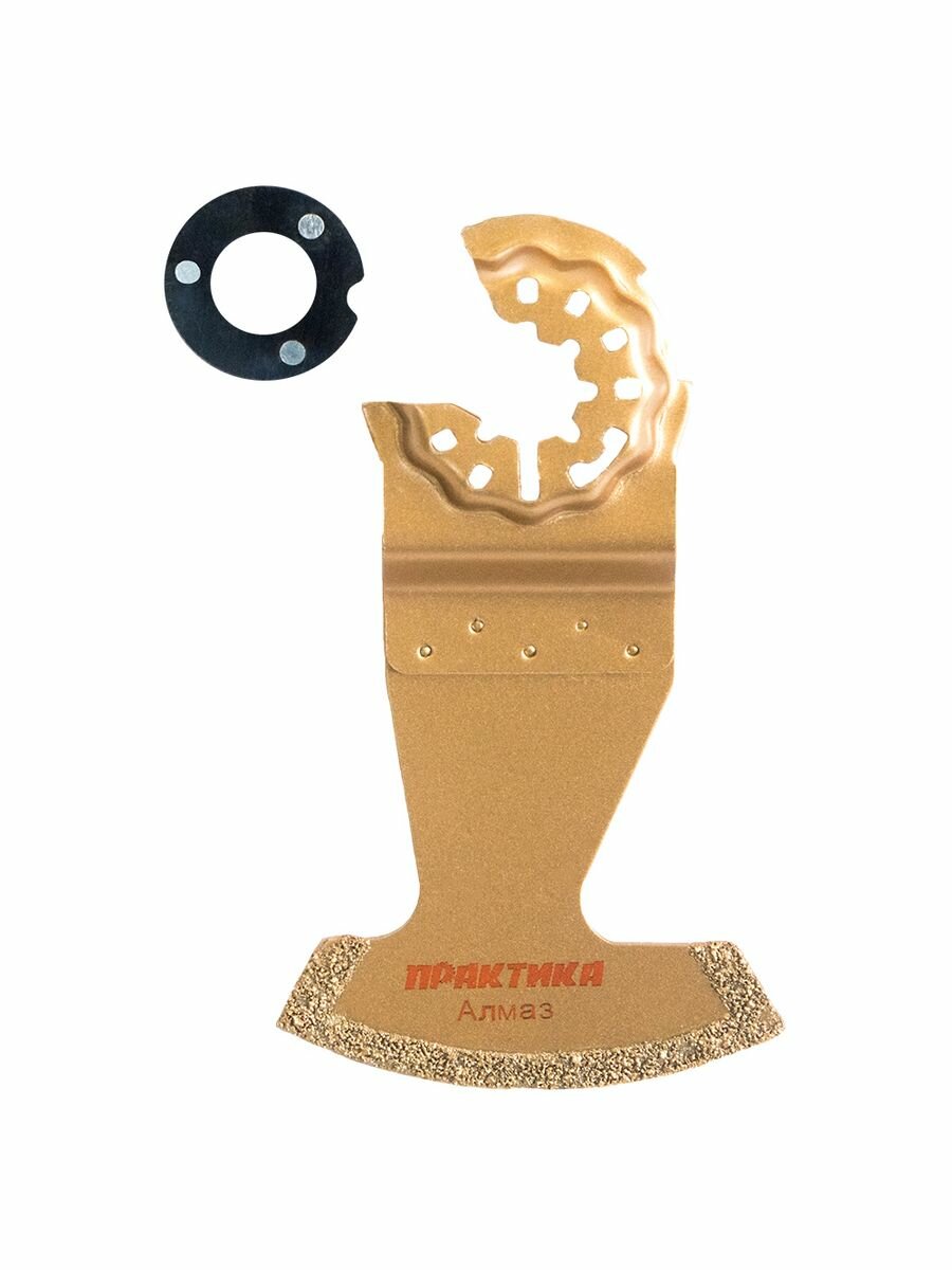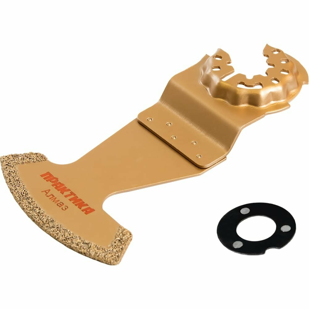 Насадка для МФИ по камню и плитке (57 мм) ПРАКТИКА используется совместно с многофункциональным инструментом. Применяется для обработки мягкой и средней твердости плитки, керамики, стекла, плиточных швов, кирпича и стеклопластиков. Насадка изготовлена из инструментальной стали с алмазным напылением.