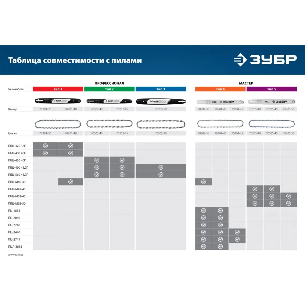 | Совместимая техника | бензопила (Зубр) (ПБЦ-370 35п, ПБЦ-380 35п, ПБЦ-400 40п, ЗЦПБ-370, ЗЦП-2000-02, ЗЦ) |