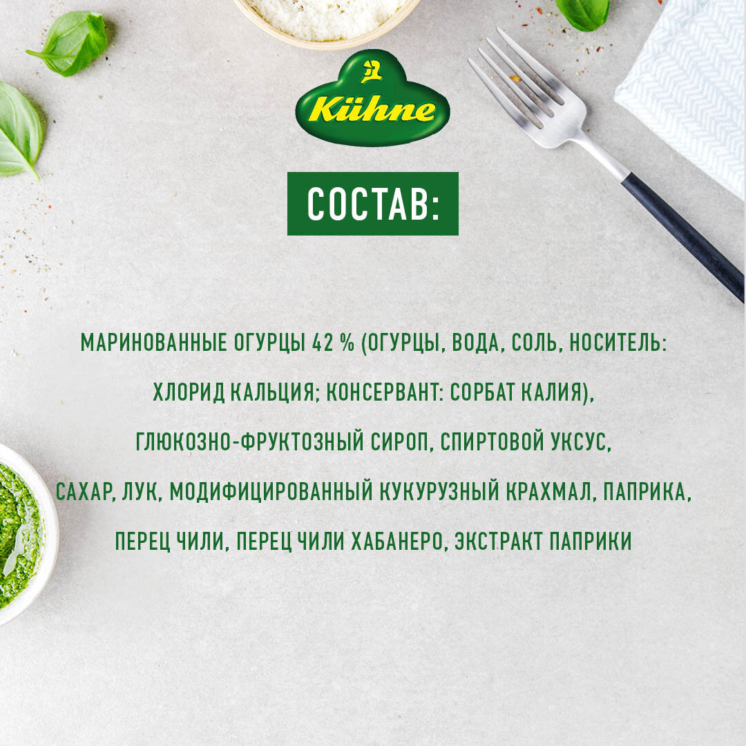 | Состав | Маринованные огурцы 42 % (огурцы, вода, соль, носитель: хлорид кальция, консервант: сорбат калия), глюкозно-фруктозный сироп, спиртовой уксус, сахар, лук, модифицированный кукурузный крахмал, паприка, перец Чили, перец Чили Хабанеро, экстракт паприки. |