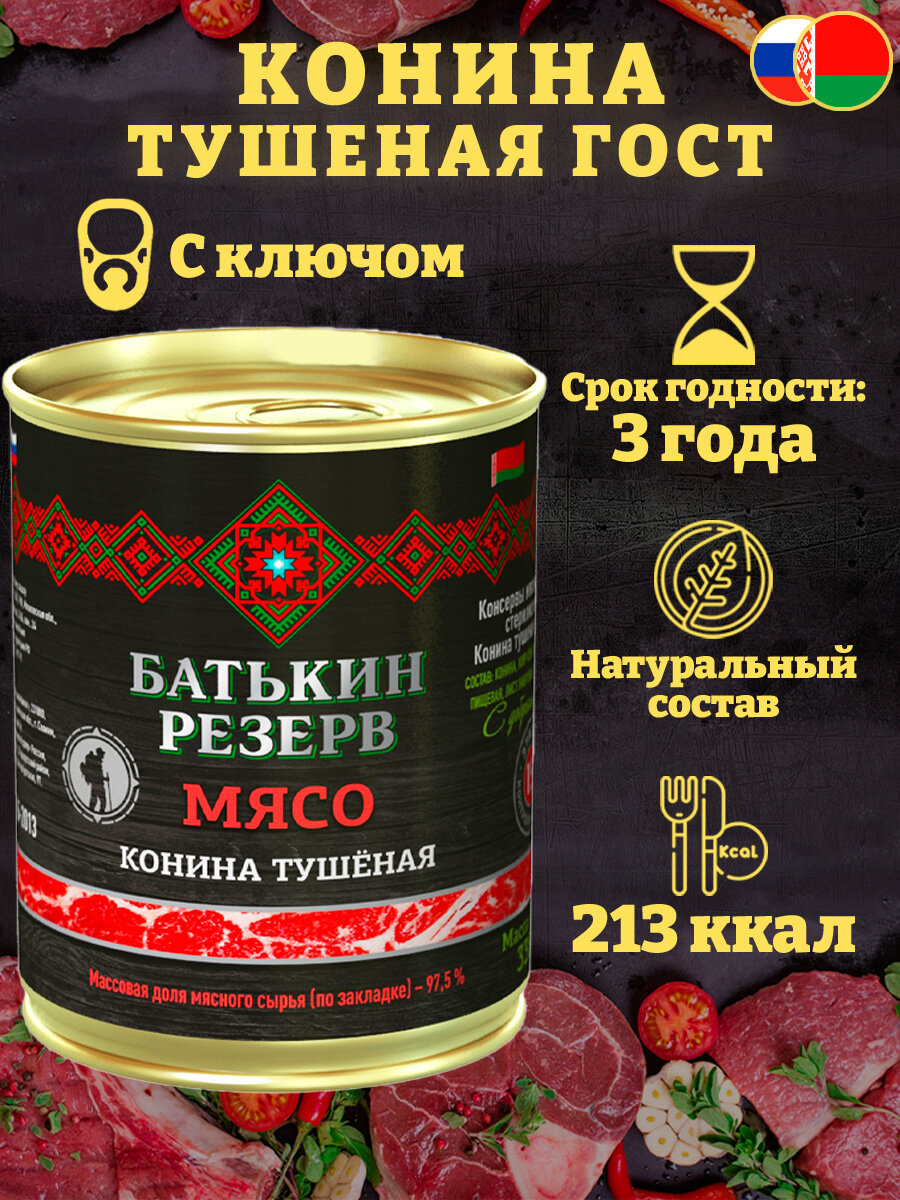 Сервис сравнения цен СкидкаГИД предлагает сравнить цены на товар «Конина тушеная Батькин Резерв Банка жестяная 338 г»