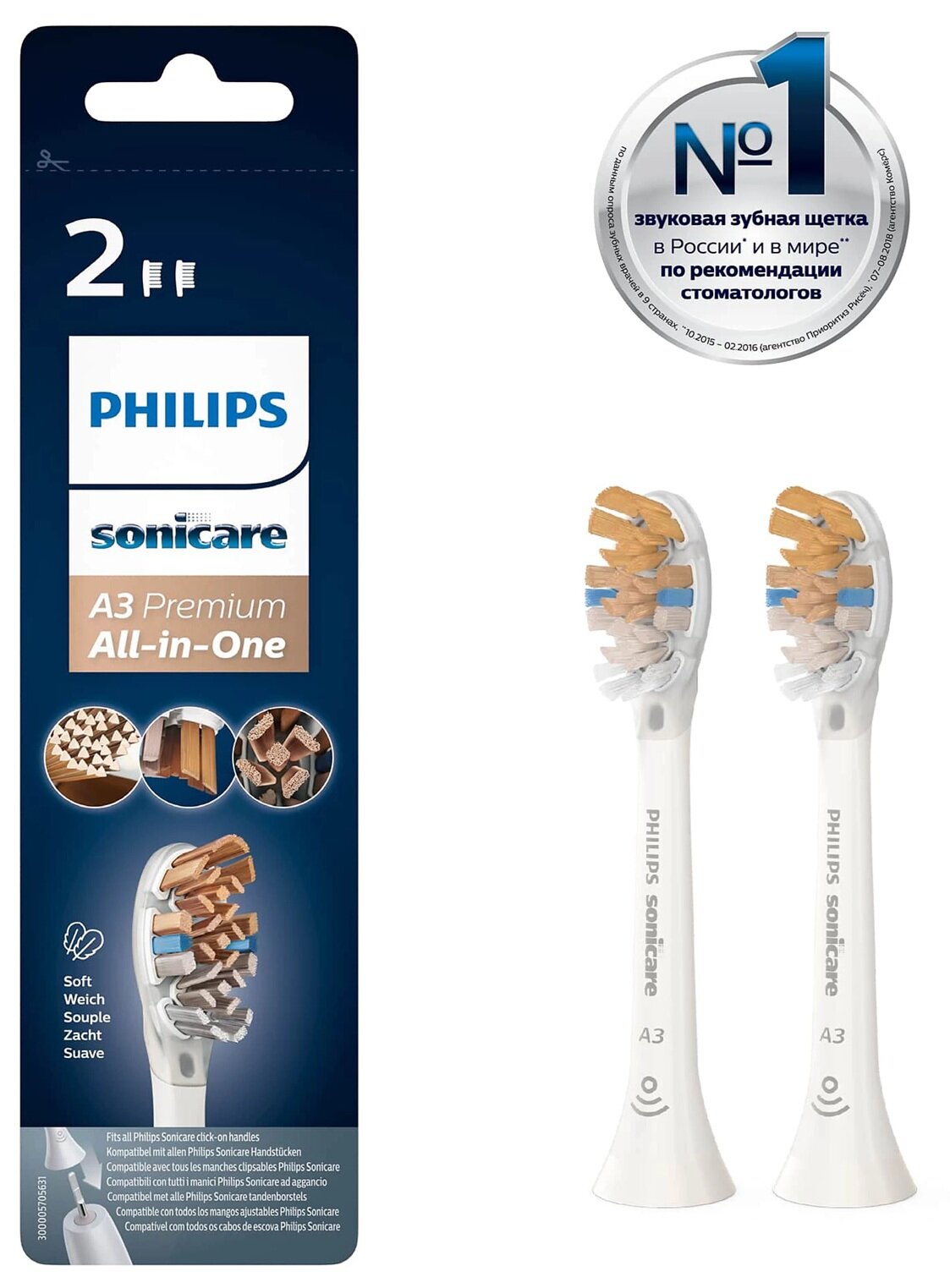 Philips Sonicare A3 Premium All in One HX9092/11— это то, что вам нужно для осветления зубов избавления от налета и ухода за деснами. Насадка удаляет до 20 раз больше налета, до 100 % больше потемнений и делает десны до 15 раз более здоровыми всего за 2 недели использования в сравнении с обычный зубной щеткой. В упаковке 2 насадки. Производитель рекомендует менять насадки каждый 3 месяца использования.
