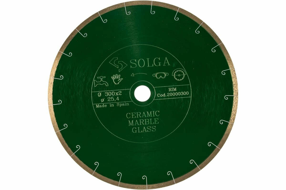 Алмазный диск Solga Diamant CERAMICS, MARBLE сплошной 300 мм предназначен для резки керамической плитки, керамики, мрамора на электрических плиткорезах и камнерезных станках. Сплошная форма сегмента обеспечивает точный и гладкий рез без сколов. Компенсаторы (теплосъёмники) обеспечивают отвод излишнего тепла и напряжения с корпуса диска, что позволяет избежать деформации при продолжительной работе с твёрдыми материалами. Обязательна подача воды в место реза. Диаметр диска - 300 мм. Посадка диска -25,4. Толщина сегмента -2 мм.