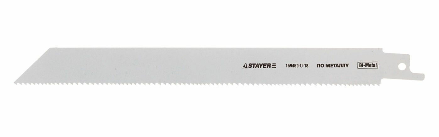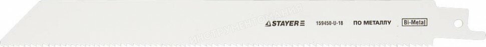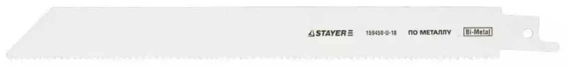 | Прочие характеристики и свойства | Полотно для сабельной электроножовки, STAYER, PROFESSIONAL, 159450-U-18 Предназначены для прямолинейного распила тонколистового металла, алюминия, древесины с гвоздями, пластмассы и оргстекла. Применяется на сабельной электрической ножовке при резке:,- Древесина с гвоздями до 175мм;,- Листовой метал до 10мм;,- Алюминиевый / пластиковый профиль до 175мм,-Материал полотна:Би-металл,-Тип хвостовика |