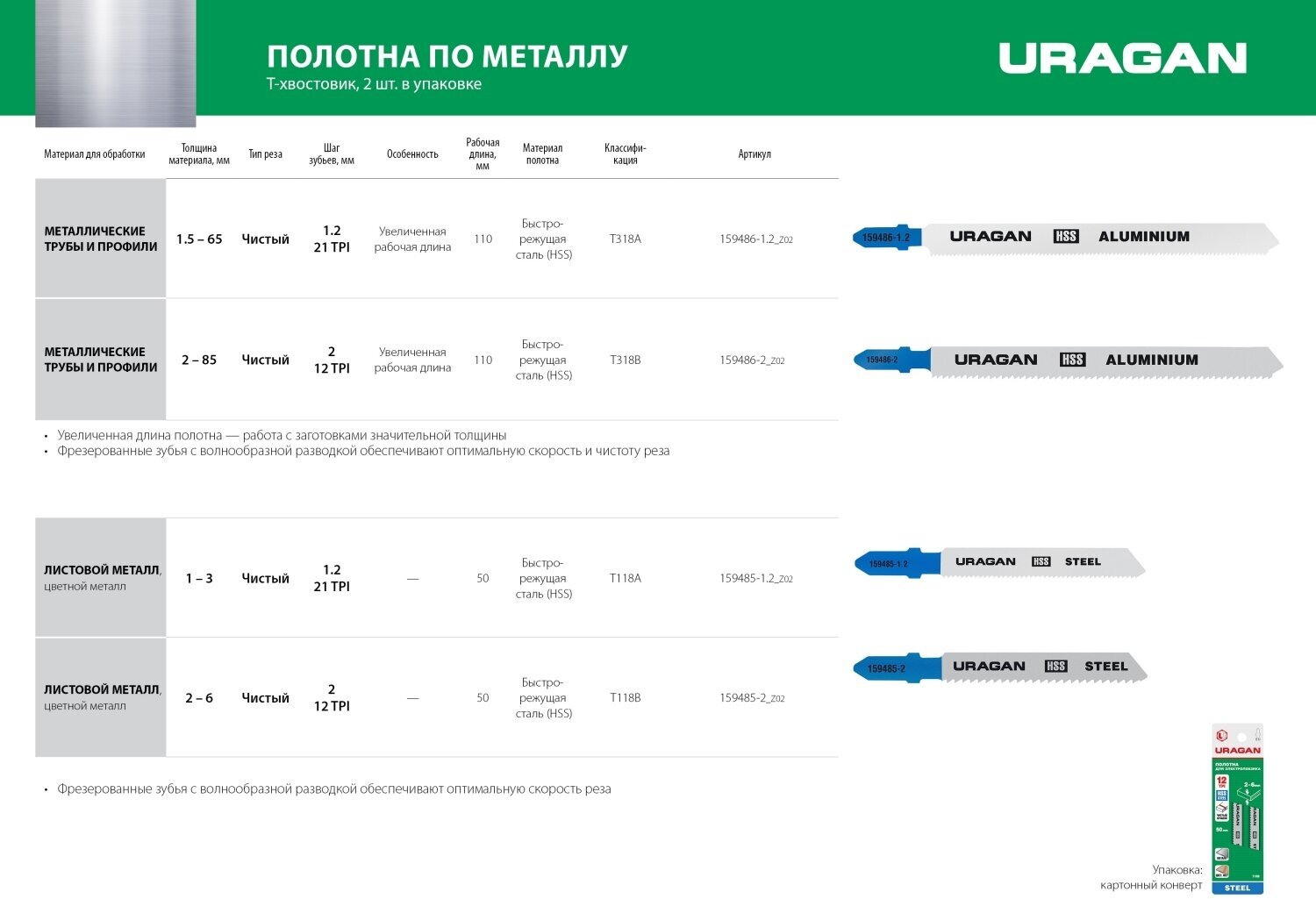 -Размер полотна: 50 x 1,2 mm -Классификация по Bosch: T118A, Полотна URAGAN обладают увеличенным рабочим ресурсом и имеют повышенную стойкость к излому.ПреимуществаИзготовлены на полностью автоматизированных производственных линиях с применением новейших методов шлифовки, разводки и заточки зубьев.ИспользованиеПолотна применяются на электрическом лобзике для реза листового металла и цветных металлов