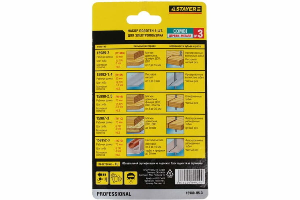 | Наименование модели | набор "PROFI" Пилки "УНИВЕРСАЛ №3" для эл/лобзика, по дереву, мет. и пласт., EU-хвост., 5шт |