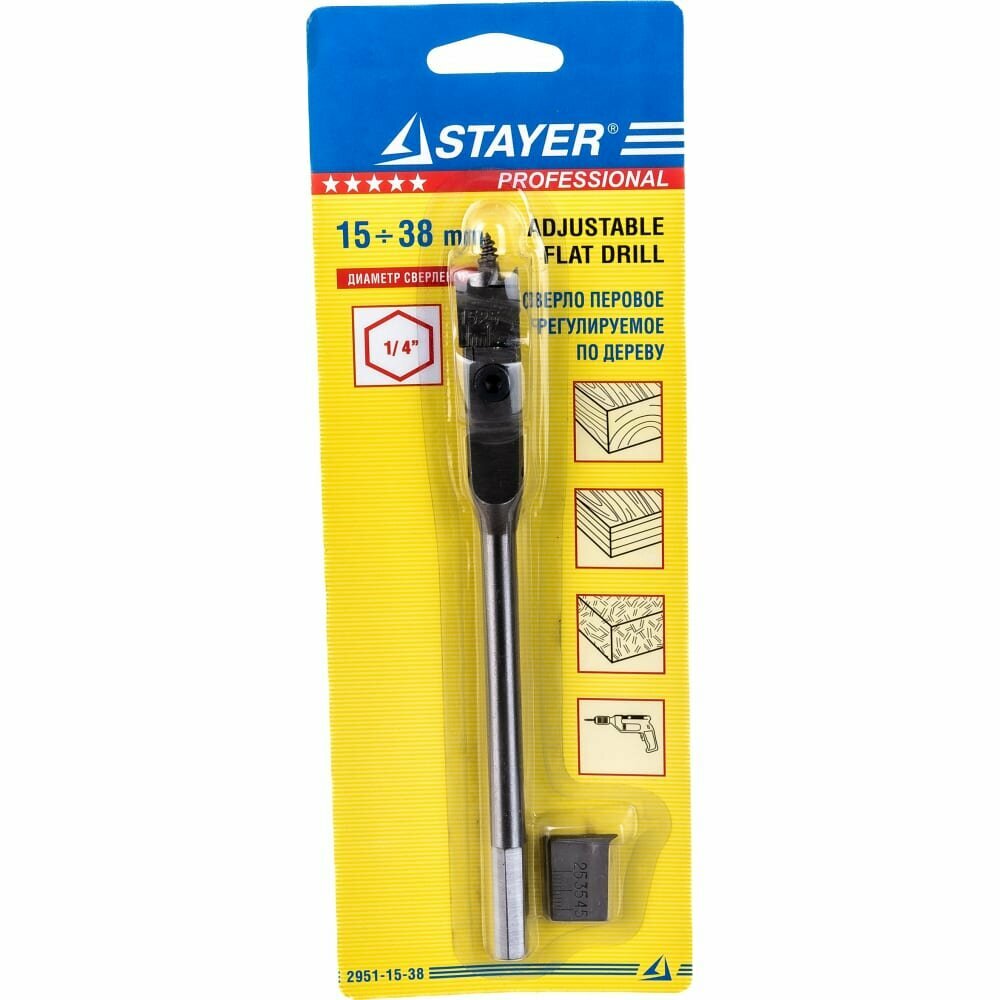 Перьевое сверло STAYER по дереву, регулируемое, 15-38 мм ( ) Регулируемое перовое сверло предназначено для просверливания отверстий диаметром 15-76 мм в древесине, ДСП, фанере. При просверливании больших отверстий следует использовать малые скорости вращения и подачи. Может применяться с ручными и механическими станками. Легко регулируется с помощью гаечного ключа или отвертки.