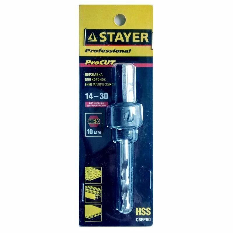 Державка "PROFESSIONAL" с шестигранным хвостовиком для коронок (13-30 мм) STAYER 29549 применяется совместно с биметаллическими коронками STAYER. Державка имеет шестигранный хвостовик и резьбу 1/2". Применяется при сверлении металла, дерева, ДСП, гипсокартона, алюминия и твердых пластмасс. Максимальный диаметр коронки: 30 мм. Максимальная глубина сверления: 14 мм. Размер хвостовика коронки - 9 мм.Преимущества Державка изготовлена только из качественных материалов, что повышает срок службы Материал корпуса - углеродистая сталь Материал сверла - быстрорежущая сталь