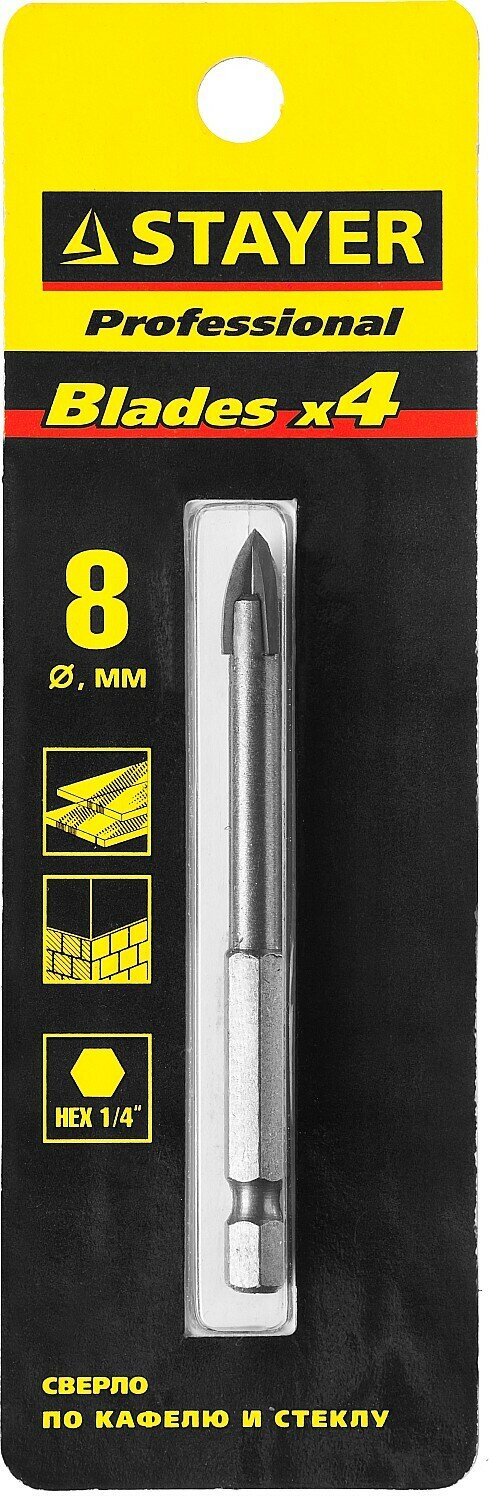 Диаметр: 8 мм Тип резца: 4-х резцовый Хвостовик: Шестигранный с проточкой хвостовика 1/4" Длина сверла: 80 мм Сверла по кафелю и стеклу STAYER серии PROFESSIONAL - надежный и проверенный инструмент высокого качества. Сверла предназначены для сверления отверстий в стекле, керамической и кафельной плитке.