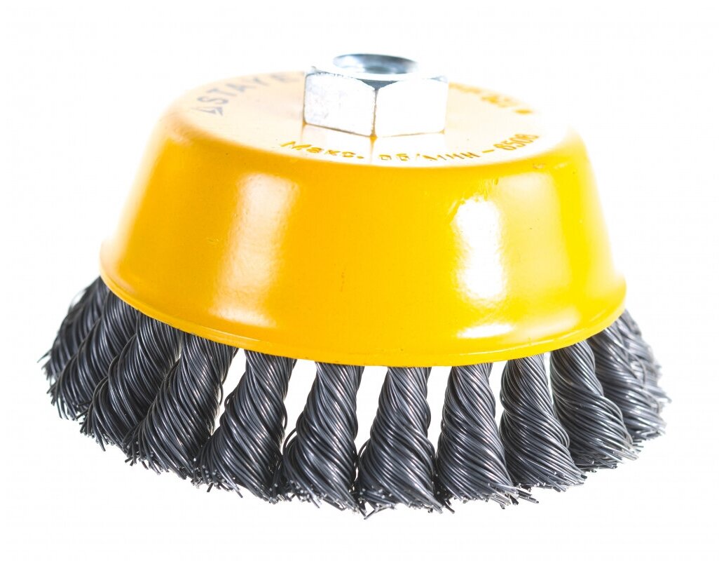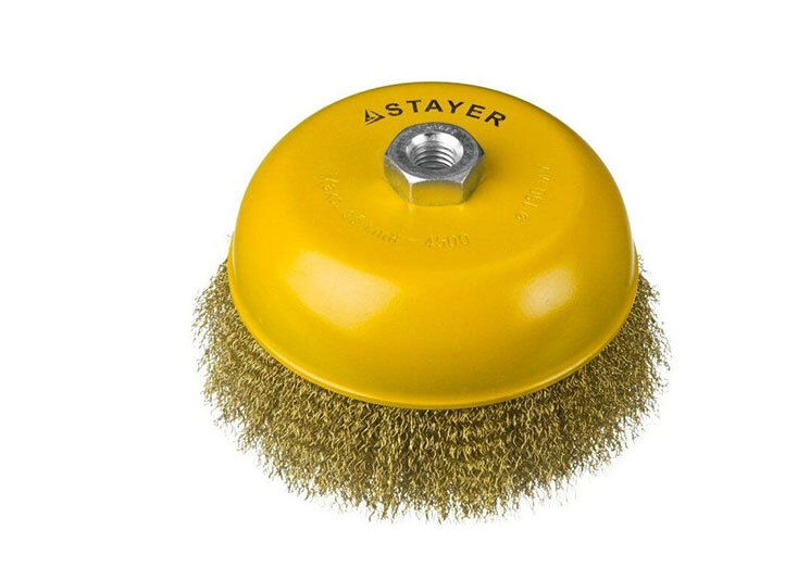 Щетка чашечная STAYER "PROFESSIONAL" с посадочным М14, плетёные пучки проволоки 0.5мм, 120мм ( 35128-120 ) Все изготавливаемые щетки STAYER серии PROFESSIONAL соответствуют действующим стандартам качества и обеспечивают безопасную работу в указанном диапазоне оборотов. Применяются на УШМ для удаления застарелых лакокрасочных покрытий, въевшейся грязи, ржавчины, окалины с поверхностей стальных изделий, а также для зачистки сварных швов.